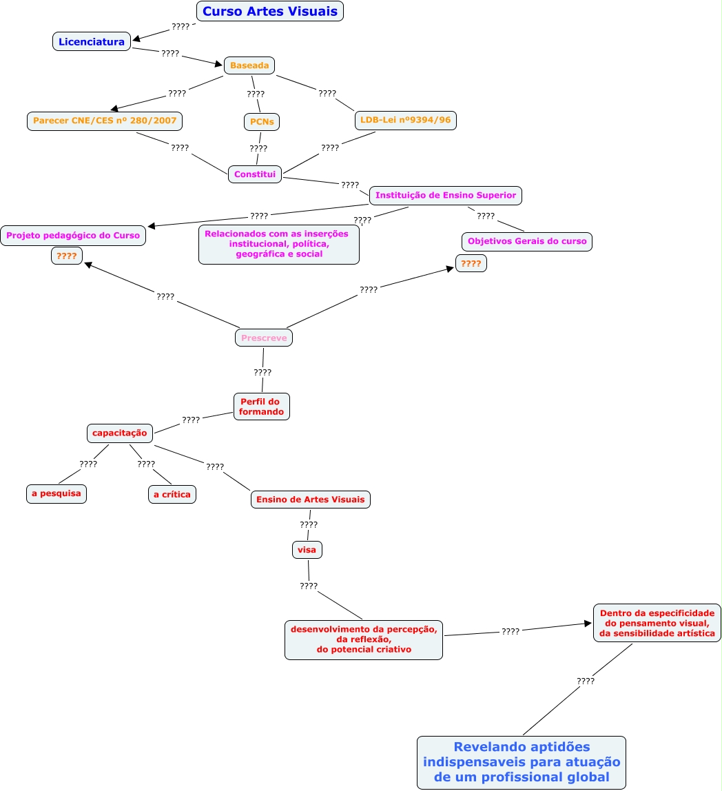 Esse mapa conceitual, produzido no IHMC CmapTools, tem a informação relacionada a: Mapa 1-Currículo de um curso de formação de professores de Artes Visuais, Perfil do formando ???? capacitação, Baseada ???? Parecer CNE/CES nº 280/2007, capacitação ???? a crítica, Ensino de Artes Visuais ???? visa, Prescreve ???? ????, Baseada ???? PCNs, desenvolvimento da percepção, da reflexão, do potencial criativo ???? Dentro da especificidade do pensamento visual, da sensibilidade artística, Prescreve ???? ????, Parecer CNE/CES nº 280/2007 ???? Constitui, Instituição de Ensino Superior ???? Projeto pedagógico do Curso, capacitação ???? Ensino de Artes Visuais, capacitação ???? a pesquisa, Constitui ???? Instituição de Ensino Superior, Licenciatura ???? Baseada, visa ???? desenvolvimento da percepção, da reflexão, do potencial criativo, Instituição de Ensino Superior ???? Objetivos Gerais do curso, LDB-Lei nº9394/96 ???? Constitui, Prescreve ???? Perfil do formando, Dentro da especificidade do pensamento visual, da sensibilidade artística ???? Revelando aptidões indispensaveis para atuação de um profissional global, Instituição de Ensino Superior ???? Relacionados com as inserções institucional, política, geográfica e social