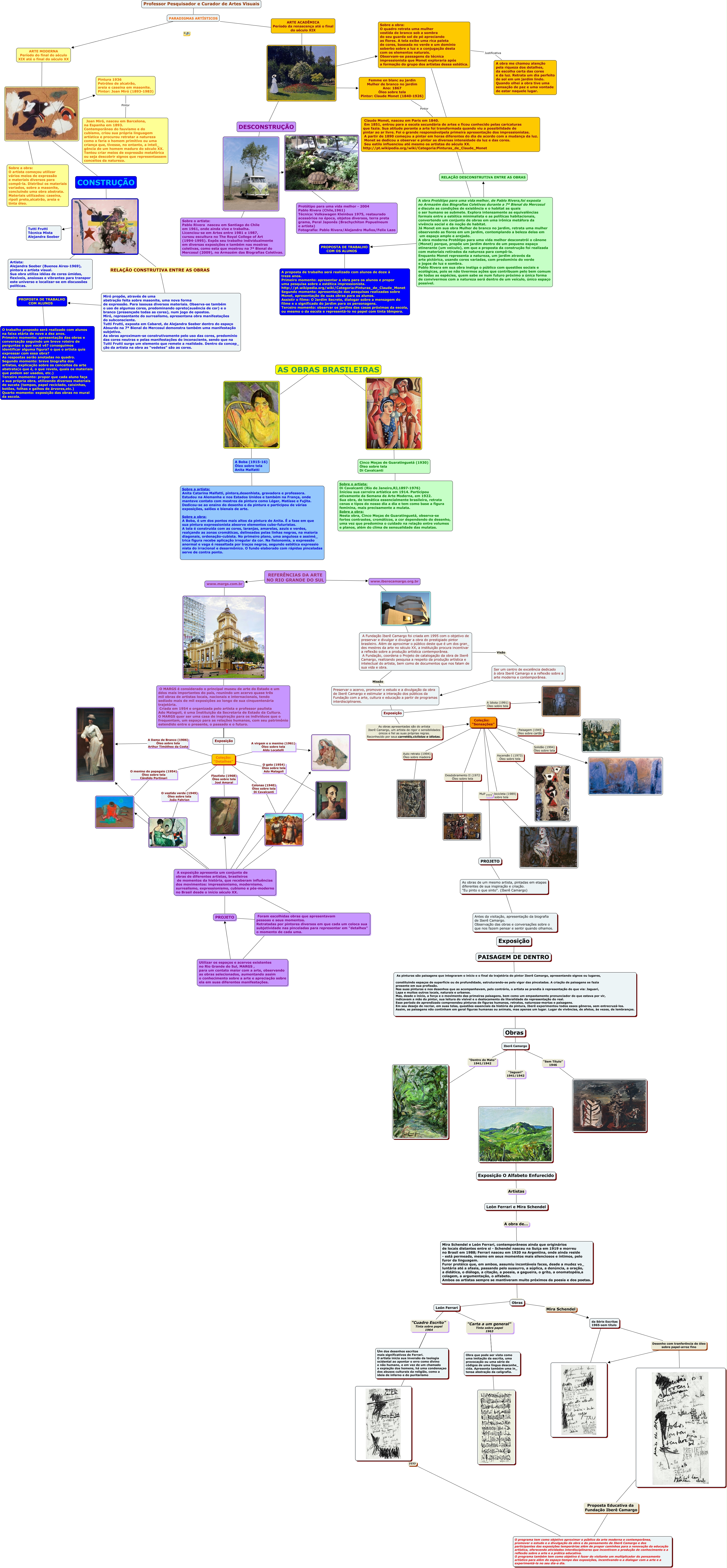 Esse mapa conceitual, produzido no IHMC CmapTools, tem a informação relacionada a: Professor pesquisador e curador de Artes Visuais, As obras de um mesmo artista, pintadas em etapas diferentes de sua inspiração e criação. "Eu pinto o que sinto". (Iberê Camargo) ???? Antes da visitação, apresentação da biografia de Iberê Camargo. Observação das obras e conversações sobre o que nos fazem pensar e sentir quando olhamos., Coleção: "Sensações" Solidão (1994) Óleo sobre tela, Coleção: "Detalhes" Flautista (1968) Óleo sobre tela Joel Amaral, A obra Protótipo para uma vidamelhor, de Pablo Rivera,foi exposta no Armazém das Biografias Coletivas durante a 7ª Bienal do Mercosul ediscute as condições de existência e o habitat as quais o ser humano se submete. Explora intensamente as equivalências formais entre a estética minimalista e as políticas habitacionais, convertendo um conjunto de obras em uma irônica metáfora da vivência social e da noção de habitat. Já Monet em sua obra Mulher de branco no jardim, retrata uma mulher observando as flores em um jardim, contemplando a beleza delas em um espaço amplo e arejado. A obra moderna Protótipo para uma vida melhor desconstrói o cânone (Monet) porque, propõe um jardim dentro de um pequeno espaço etinerante (um veículo), em que a proposta da construção foi realizada com materiais retirados da natureza para compô-la. Enquanto Monet representa a natureza, um jardim através da arte pictórica, usando cores variadas, com predomínio do verde e jogos de luz e sombra. Pablo Rivera em sua obra instiga o público com questões sociais e ecológicas, pois se não tivermos ações que contribuam pelo bem comum de todas as espécies, quem sabe se num futuro próximo a única forma de convivermos com a natureza será dentro de um veículo, único espaço possível. ???? RELAÇÃO DESCONSTRUTIVA ENTRE AS OBRAS, A exposição apresenta um conjunto de obras de diferentes artistas, brasileiros de momentos da história, que receberam influências dos movimentos: impressionismo, modernismo, surrealismo, expressionismo, cubismo e pós-moderno no Brasil desde o início século XX. ????, Coleção: "Detalhes" O menino do papagaio (1954) Óleo sobre tela Cândido Portinari, ???? A Boba (1915-16) Óleo sobre tela Anita Malfatti, Iberê Camargo "Dentro do Mato" 1941/1942, Exposição As obras apresentadas são do artista Iberê Camargo, um artista de rigor e sensibilidades únicos e fiel as suas próprias regras. Reconhecido por seus carretéis,ciclistas e idiotas. Coleção: "Sensações", ???? Tutti Frutti Técnica Mista Alejandra Seeber, A exposição apresenta um conjunto de obras de diferentes artistas, brasileiros de momentos da história, que receberam influências dos movimentos: impressionismo, modernismo, surrealismo, expressionismo, cubismo e pós-moderno no Brasil desde o início século XX. ????, Exposição O Alfabeto Enfurecido Artistas León Ferrari e Mira Schendel, A Fundação Iberê Camargo foi criada em 1995 com o objetivo de preservar e divulgar e divulgar a obra do prestigiado pintor brasileiro. Além de aproximar o público deste que é um dos gran_ des mestres da arte no século XX, a instituição procura incentivar a reflexão sobre a produção artística contemporânea. A Fundação, coordena o Projeto de catalogação da obra de Iberê Camargo, realizando pesquisa a respeito da produção artística e intelectual do artista, bem como de documentos que nos falam de sua vida e obra. Missão Preservar o acervo, promover o estudo e a divulgação da obra de Iberê Camargo e estimular a interação dos públicos da Fundação com a arte, cultura e educação a partir de programas interdisciplinares., www.margs.com.br ???? ????, PARADIGMAS ART�?STICOS ???? ARTE ACADÊMICA Período da renascença até o final do século XIX, ???? O programa tem como objetivo aproximar o público da arte moderna e contemporânea, promover o estudo e a divulgação da obra e do pensamento de Iberê Camargo e dos participantes das exposições temporárias além de propor caminhos para a renovação da educação artística, oferecendo atividades interdisciplinares que incentivem a produção de conhecimento e a reflexão sobre a arte e a prática educativa. O programa também tem como objetivo é fazer do visitante um multiplicador do pensamento artístico para além do espaço-tempo das exposições, incentivando-o a dialogar com a arte e a experimentá-la no seu dia-a dia., ARTE ACADÊMICA Período da renascença até o final do século XIX ????, da Série Escritas 1965-sem título ????, A exposição apresenta um conjunto de obras de diferentes artistas, brasileiros de momentos da história, que receberam influências dos movimentos: impressionismo, modernismo, surrealismo, expressionismo, cubismo e pós-moderno no Brasil desde o início século XX. ????, A exposição apresenta um conjunto de obras de diferentes artistas, brasileiros de momentos da história, que receberam influências dos movimentos: impressionismo, modernismo, surrealismo, expressionismo, cubismo e pós-moderno no Brasil desde o início século XX. ????