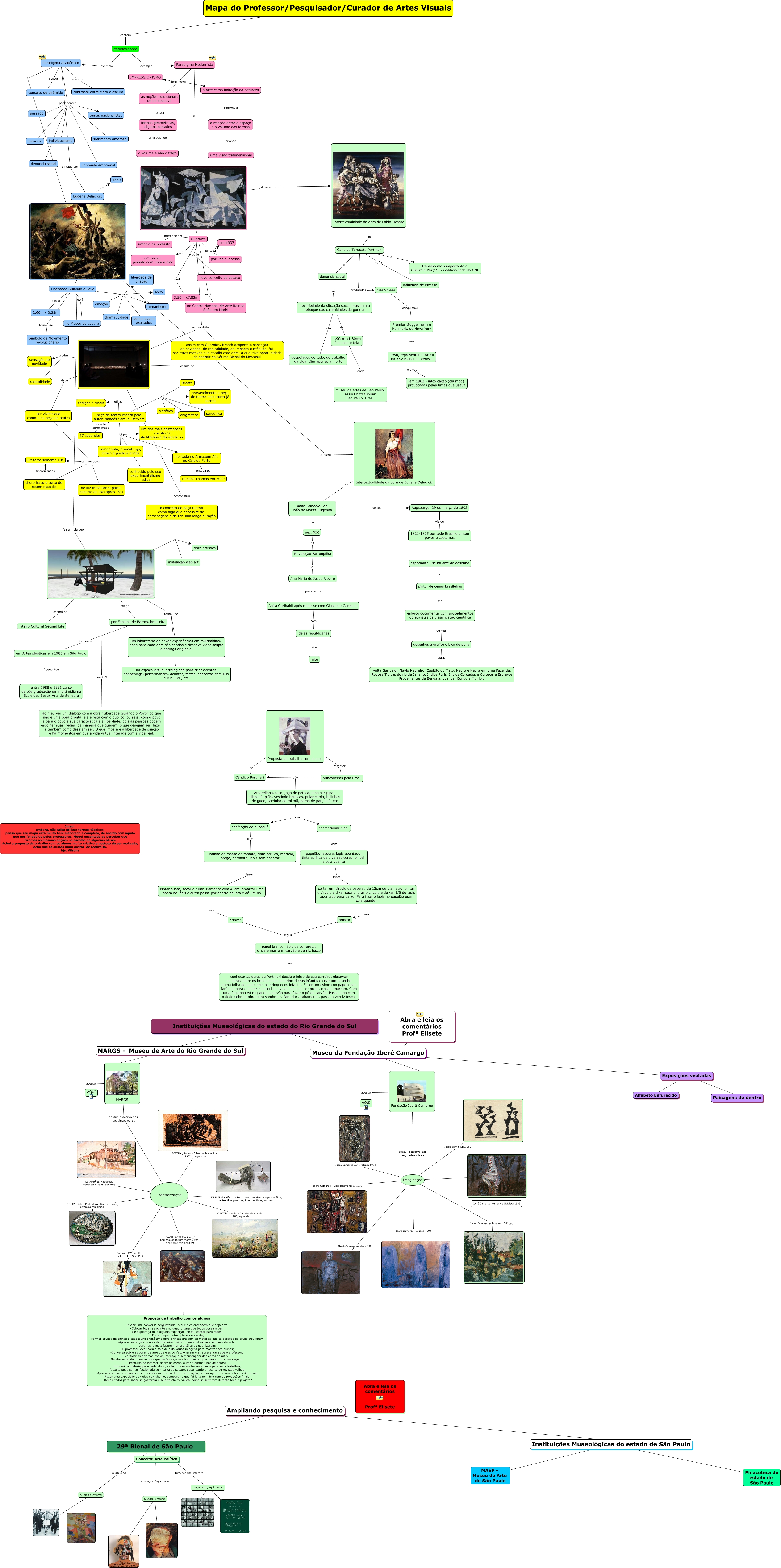 Esse mapa conceitual, produzido no IHMC CmapTools, tem a informação relacionada a: Mapa do Professor pesq-Curador_Atualizado, Anita Garibaldi após casar-se com Giuseppe Garibaldi com idéias republicanas, tornou-se um laboratório de novas experiências em multimídias, onde para cada obra são criados e desenvolvidos scripts e desings originais., é instalação web art, Fundação Iberê Camargo acesse AQUI, Guernica possui 3,50m x7,82m, Transformação FIDELIS-Gaudêncio - Sem título, sem data, chapa metálica, feltro, fitas plásticas, fitas metálicas, arames, 1950, representou o Brasil na XXV Bienal de Veneza morreu em 1962 - intoxicação (chumbo) provocadas pelas tintas que usava, cortar um círculo de papelão de 13cm de diâmetro, pintar o círculo e dixar secar. furar o círculo e deixar 1/5 do lápis apontado para baixo. Para fixar o lápis no papelão usar cola quente. para brincar, Ampliando pesquisa e conhecimento ???? Instituições Museológicas do estado do Rio Grande do Sul, produz sensação de novidade, Imaginação ????, Liberdade Guiando o Povo possui 2,60m x 3,25m, Liberdade Guiando o Povo retrata emoção, Transformação CAVALCANTI-Emiliano_Di Composição [Cristo morto], 1941, óleo sobre tela 126X 193, ???? Proposta de trabalho com os alunos -Iniciar uma conversa perguntando: o que eles entendem que seja arte. -Colocar todas as opinões no quadro para que todos possam ver; -Se alguém já foi a alguma exposição, se foi, contar para todos; - Trazer papel,tintas, pincéis e sucata; - Formar grupos de alunos e cada aluno criará uma obra-brincadeira com os materias que as pessoas do grupo trouxeram; -Após a confecção da obra-brincadeira ,deixar o material exposto em sala de aula; -Levar os lunos a fazerem uma análise do que fizeram; - O professor levar para a sala de aula várias imagens para mostrar aos alunos; -Conversa sobre as obras de arte que eles confeccionaram e as apresentadas pelo professor; Verificar os diversos estilos, cores,qual a menseagem das obras de arte. Se eles entendem que sempre que se faz alguma obra o autor quer passar uma mensagem; -Pesquisa na internet, sobre as obras, autor e outros tipos de obras; -Imprimir o material para cada aluno, cada um deverá ter uma pasta para seus trabalhos; -A pasta pode ser confeccionada com caixa de sapato, papel pardo e recorte de revistas velhas; - Após os estudos, os alunos devem achar uma forma de transformação, recriar apartir de uma obra e criar a sua; -Fazer uma exposição de todos os trabalho, comparar o que foi feito no inicio com as produções finais. - Reunir todos para saber se gostaram e se a tarefa foi válida, como se sentiram durante todo o projeto?, Ampliando pesquisa e conhecimento ???? 29ª Bienal de São Paulo, Liberdade Guiando o Povo tornou-se Símbolo de Movimento revolucionário, Paradigma Acadêmico pode conter natureza, peça de teatro escrita pelo autor irlandês Samuel Beckett foi conhecido pelo seu experimentalismo radical, desconstrói o conceito de peça teatral como algo que necessite de personagens e de ter uma longa duração