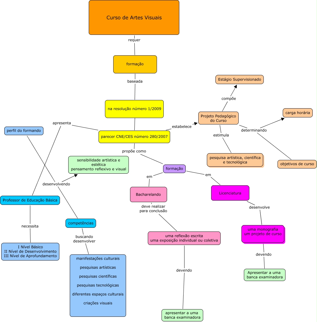 Esse mapa conceitual, produzido no IHMC CmapTools, tem a informação relacionada a: Mapa do Curso de Artes Visuais 2, Licenciatura desenvolve uma monografia um projeto de curso, formação baseada na resolução número 1/2009, parecer CNE/CES número 280/2007 propõe como formação, Projeto Pedagógico do Curso estimula pesquisa artística, científica e tecnológica, Projeto Pedagógico do Curso determinando carga horária, Projeto Pedagógico do Curso determinando objetivos de curso, Bacharelando deve realizar para conclusão uma reflexão escrita uma exposição individual ou coletiva, Professor de Educação Básica necessita I Nível Básico II Nível de Desenvolvimento III Nível de Aprofundamento, parecer CNE/CES número 280/2007 estabelece Projeto Pedagógico do Curso, perfil do formando desenvolvendo competências, uma monografia um projeto de curso devendo Apresentar a uma banca examinadora, Projeto Pedagógico do Curso compõe Estágio Supervisionado, competências buscando desenvolver manifestações culturais pesquisas artísticas pesquisas científicas pesquisas tecnológicas diferentes espaços culturais criações visuais, na resolução número 1/2009 parecer CNE/CES número 280/2007, uma reflexão escrita uma exposição individual ou coletiva devendo apresentar a uma banca examinadora, parecer CNE/CES número 280/2007 apresenta Professor de Educação Básica, perfil do formando desenvolvendo sensibilidade artística e estética pensamento reflexivo e visual, formação em Bacharelando, Curso de Artes Visuais requer formação, formação em Licenciatura