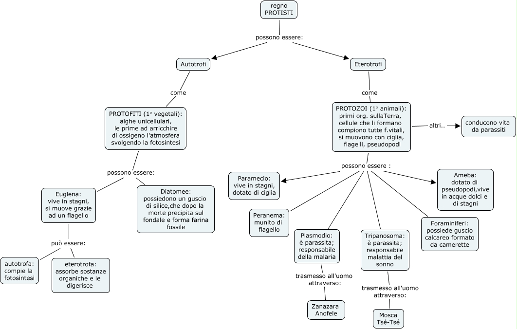 Questa Cmap, creata con IHMC CmapTools, contiene informazioni relative a: Protisti - Aury, PROTOFITI (1° vegetali): alghe unicellulari, le prime ad arricchire di ossigeno l'atmosfera svolgendo la fotosintesi possono essere: Diatomee: possiedono un guscio di silice,che dopo la morte precipita sul fondale e forma farina fossile, Eterotrofi come PROTOZOI (1° animali): primi org. sullaTerra, cellule che li formano compiono tutte f.vitali, si muovono con ciglia, flagelli, pseudopodi, Plasmodio: è parassita; responsabile della malaria trasmesso all'uomo attraverso: Zanazara Anofele, PROTOZOI (1° animali): primi org. sullaTerra, cellule che li formano compiono tutte f.vitali, si muovono con ciglia, flagelli, pseudopodi possono essere : Peranema: munito di flagello, PROTOZOI (1° animali): primi org. sullaTerra, cellule che li formano compiono tutte f.vitali, si muovono con ciglia, flagelli, pseudopodi altri.. conducono vita da parassiti, Tripanosoma: è parassita; responsabile malattia del sonno trasmesso all'uomo attraverso: Mosca Tsé-Tsé, PROTOFITI (1° vegetali): alghe unicellulari, le prime ad arricchire di ossigeno l'atmosfera svolgendo la fotosintesi possono essere: Euglena: vive in stagni, si muove grazie ad un flagello, regno PROTISTI possono essere: Eterotrofi, Euglena: vive in stagni, si muove grazie ad un flagello può essere: autotrofa: compie la fotosintesi, PROTOZOI (1° animali): primi org. sullaTerra, cellule che li formano compiono tutte f.vitali, si muovono con ciglia, flagelli, pseudopodi possono essere : Tripanosoma: è parassita; responsabile malattia del sonno, PROTOZOI (1° animali): primi org. sullaTerra, cellule che li formano compiono tutte f.vitali, si muovono con ciglia, flagelli, pseudopodi possono essere : Foraminiferi: possiede guscio calcareo formato da camerette, regno PROTISTI possono essere: Autotrofi, PROTOZOI (1° animali): primi org. sullaTerra, cellule che li formano compiono tutte f.vitali, si muovono con ciglia, flagelli, pseudopodi possono essere : Paramecio: vive in stagni, dotato di ciglia, PROTOZOI (1° animali): primi org. sullaTerra, cellule che li formano compiono tutte f.vitali, si muovono con ciglia, flagelli, pseudopodi possono essere : Ameba: dotato di pseudopodi,vive in acque dolci e di stagni, Euglena: vive in stagni, si muove grazie ad un flagello può essere: eterotrofa: assorbe sostanze organiche e le digerisce, Autotrofi come PROTOFITI (1° vegetali): alghe unicellulari, le prime ad arricchire di ossigeno l'atmosfera svolgendo la fotosintesi, PROTOZOI (1° animali): primi org. sullaTerra, cellule che li formano compiono tutte f.vitali, si muovono con ciglia, flagelli, pseudopodi possono essere : Plasmodio: è parassita; responsabile della malaria