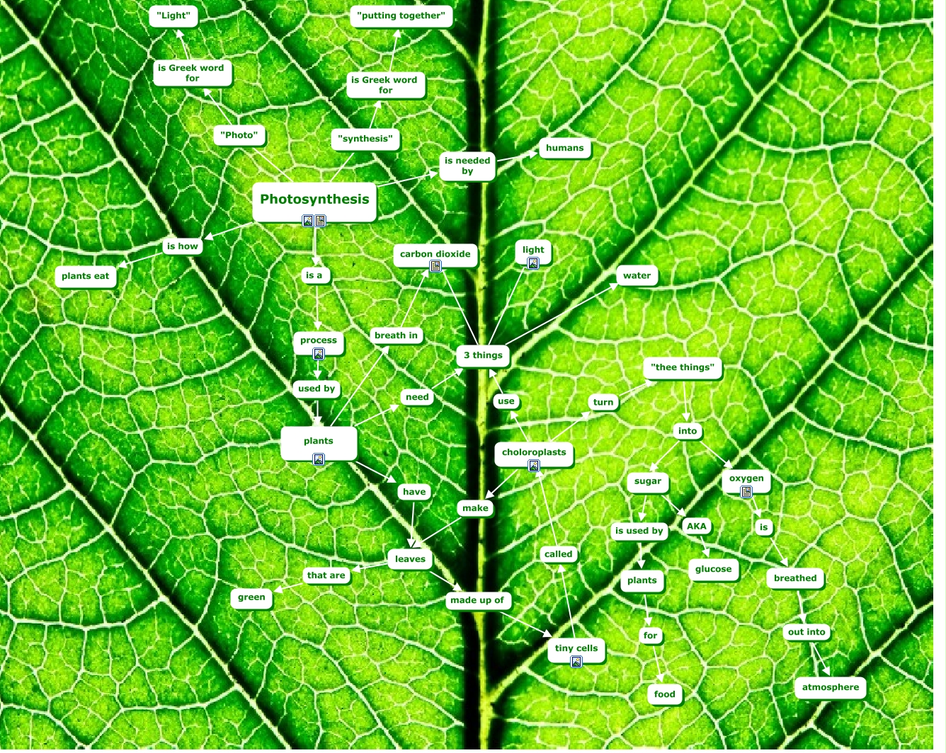 This Concept Map, created with IHMC CmapTools, has information related to: Photosynthesis, tiny cells called choloroplasts, Photosynthesis ???? "synthesis", Photosynthesis is a process, leaves that are green, 3 things ???? carbon dioxide, sugar is used by plants, breathed out into atmosphere, choloroplasts make leaves, "synthesis" is Greek word for "putting together", plants for food, leaves made up of tiny cells, "thee things" into sugar, sugar AKA glucose, Photosynthesis is how plants eat, oxygen is breathed, plants have leaves, "thee things" into oxygen, choloroplasts use 3 things, Photosynthesis ???? "Photo", 3 things ???? light