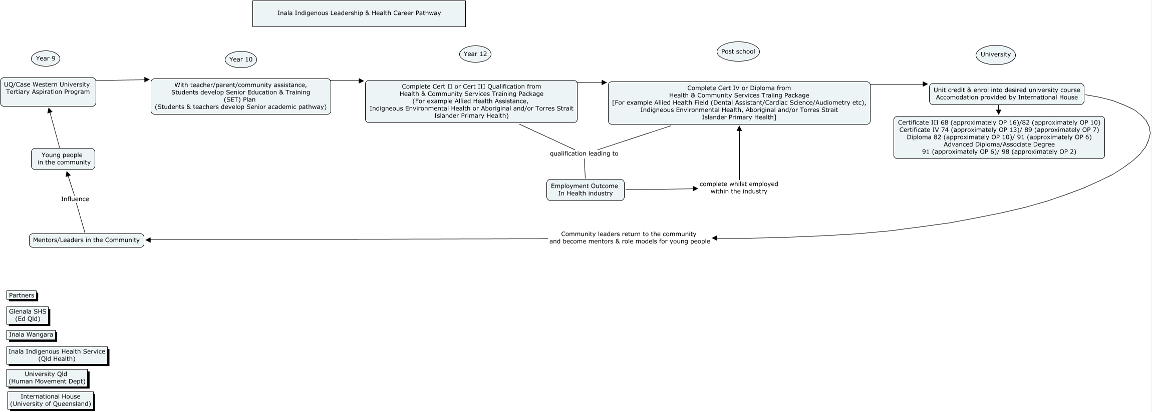 This Concept Map, created with IHMC CmapTools, has information related to: Inala indigenous leadership and health career pathway, Employment Outcome In Health industry complete whilst employed within the industry Complete Cert IV or Diploma from Health & Community Services Traiing Package [For example Allied Health Field (Dental Assistant/Cardiac Science/Audiometry etc), Indigneous Environmental Health, Aboriginal and/or Torres Strait Islander Primary Health], With teacher/parent/community assistance, Students develop Senior Education & Training (SET) Plan (Students & teachers develop Senior academic pathway) Complete Cert II or Cert III Qualification from Health & Community Services Training Package (For example Allied Health Assistance, Indigneous Environmental Health or Aboriginal and/or Torres Strait Islander Primary Health), Complete Cert IV or Diploma from Health & Community Services Traiing Package [For example Allied Health Field (Dental Assistant/Cardiac Science/Audiometry etc), Indigneous Environmental Health, Aboriginal and/or Torres Strait Islander Primary Health] qualification leading to Employment Outcome In Health industry, Mentors/Leaders in the Community Influence Young people in the community, Unit credit & enrol into desired university course Accomodation provided by International House ???? Certificate III 68 (approximately OP 16)/82 (approximately OP 10) Certificate IV 74 (approximately OP 13)/ 89 (approximately OP 7) Diploma 82 (approximately OP 10)/ 91 (approximately OP 6) Advanced Diploma/Associate Degree 91 (approximately OP 6)/ 98 (approximately OP 2), UQ/Case Western University Tertiary Aspiration Program With teacher/parent/community assistance, Students develop Senior Education & Training (SET) Plan (Students & teachers develop Senior academic pathway), Young people in the community ???? UQ/Case Western University Tertiary Aspiration Program, Complete Cert IV or Diploma from Health & Community Services Traiing Package [For example Allied Health Field (Dental Assistant/Cardiac Science/Audiometry etc), Indigneous Environmental Health, Aboriginal and/or Torres Strait Islander Primary Health] ???? Unit credit & enrol into desired university course Accomodation provided by International House, Complete Cert II or Cert III Qualification from Health & Community Services Training Package (For example Allied Health Assistance, Indigneous Environmental Health or Aboriginal and/or Torres Strait Islander Primary Health) qualification leading to Employment Outcome In Health industry, Complete Cert II or Cert III Qualification from Health & Community Services Training Package (For example Allied Health Assistance, Indigneous Environmental Health or Aboriginal and/or Torres Strait Islander Primary Health) ???? Complete Cert IV or Diploma from Health & Community Services Traiing Package [For example Allied Health Field (Dental Assistant/Cardiac Science/Audiometry etc), Indigneous Environmental Health, Aboriginal and/or Torres Strait Islander Primary Health], Unit credit & enrol into desired university course Accomodation provided by International House Community leaders return to the community and become mentors & role models for young people Mentors/Leaders in the Community