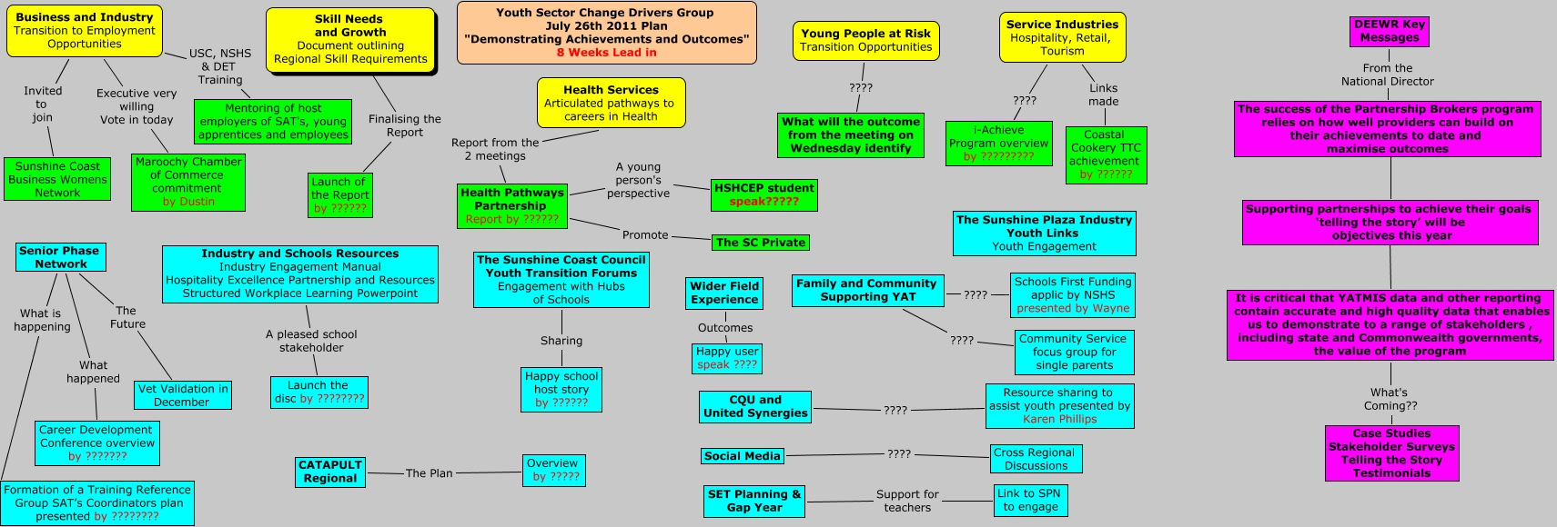 This Concept Map, created with IHMC CmapTools, has information related to: Youth Sector Change Drivers Group July 26th 2011 Planning, The success of the Partnership Brokers program relies on how well providers can build on their achievements to date and maximise outcomes ???? Supporting partnerships to achieve their goals ‘telling the story’ will be objectives this year, The Sunshine Coast Council Youth Transition Forums Engagement with Hubs of Schools Sharing Happy school host story by ??????, Service Industries Hospitality, Retail, Tourism ???? i-Achieve Program overview by ?????????, Supporting partnerships to achieve their goals ‘telling the story’ will be objectives this year ???? It is critical that YATMIS data and other reporting contain accurate and high quality data that enables us to demonstrate to a range of stakeholders , including state and Commonwealth governments, the value of the program, Health Services Articulated pathways to careers in Health Report from the 2 meetings Health Pathways Partnership Report by ??????, Business and Industry Transition to Employment Opportunities Invited to join Sunshine Coast Business Womens Network, Social Media ???? Cross Regional Discussions, Family and Community Supporting YAT ???? Community Service focus group for single parents, Industry and Schools Resources Industry Engagement Manual Hospitality Excellence Partnership and Resources Structured Workplace Learning Powerpoint A pleased school stakeholder Launch the disc by ????????, Senior Phase Network What is happening Formation of a Training Reference Group SAT’s Coordinators plan presented by ????????, Young People at Risk Transition Opportunities ???? What will the outcome from the meeting on Wednesday identify, DEEWR Key Messages From the National Director The success of the Partnership Brokers program relies on how well providers can build on their achievements to date and maximise outcomes, Service Industries Hospitality, Retail, Tourism Links made Coastal Cookery TTC achievement by ??????, Wider Field Experience Outcomes Happy user speak ????, CQU and United Synergies ???? Resource sharing to assist youth presented by Karen Phillips, Skill Needs and Growth Document outlining Regional Skill Requirements Finalising the Report Launch of the Report by ??????, SET Planning & Gap Year Support for teachers Link to SPN to engage, Business and Industry Transition to Employment Opportunities Executive very willing Vote in today Maroochy Chamber of Commerce commitment by Dustin, CATAPULT Regional The Plan Overview by ?????, Senior Phase Network The Future Vet Validation in December