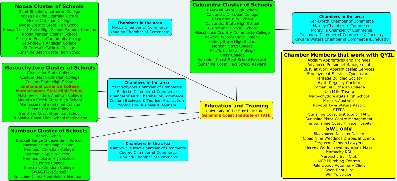 This Concept Map, created with IHMC CmapTools, has information related to: Maroochy Chamber of Commerce Purpose and School Clusters, Maroochydore Cluster of Schools Chancellor State College Coolum Beach Christian College Coolum State High School Immanuel Lutheran College Maroochydore State High School Matthew Flinders Anglican College Mountain Creek State High School Montessori International College Sienna Catholic College Sunshine Coast Grammar School Sunshine Coast Flexi School Mooloolaba ???? Chambers in the area Maroochydore Chamber of Commerce Buderim Chamber of Commerce Chancellor Park Chamber of Commerce Coolum Business & Tourism Association Mooloolaba Business & Tourism, Caloundra Cluster of Schools Beerwah State High School Caloundra Christian College Caloundra City School Caloundra State High School Currimundi Special School Glasshouse Country Community College Kawana Waters State College Maleny State High School Meridan State College Pacific Lutheran College Unity College Sunshine Coast Flexi School Beerwah Sunshine Coast Flexi School Kawana ???? Chambers in the area Kenilworth Chamber of Commerce Maleny Chamber of Commerce Montville Chamber of Commerce Caloundra Chamber of Commerce & Industry Kawana Waters Chamber of Commerce & Industry, Caloundra Cluster of Schools Beerwah State High School Caloundra Christian College Caloundra City School Caloundra State High School Currimundi Special School Glasshouse Country Community College Kawana Waters State College Maleny State High School Meridan State College Pacific Lutheran College Unity College Sunshine Coast Flexi School Beerwah Sunshine Coast Flexi School Kawana ???? Education and Training University of the Sunshine Coast Sunshine Coast Institute of TAFE, Nambour Cluster of Schools Agnew School Blackall Range Independent School Burnside State High School Nambour Christian College Nambour Special School Nambour State High School St John's College Suncoast Christian College SWAG Flexi School Sunshine Coast Flexi School Nambour ???? Education and Training University of the Sunshine Coast Sunshine Coast Institute of TAFE, Noosa Cluster of Schools Good Shepherd Lutheran College Noosa Flexible Learning Centre Noosa Christian College Noosa District State High School Noosa District State High School Pamona Campus Noosa Pengari Steiner School Peregian Beach Community College St Andrew's Anglican College St Teresa's Catholic College Sunshine Beach State High School ???? Education and Training University of the Sunshine Coast Sunshine Coast Institute of TAFE, Noosa Cluster of Schools Good Shepherd Lutheran College Noosa Flexible Learning Centre Noosa Christian College Noosa District State High School Noosa District State High School Pamona Campus Noosa Pengari Steiner School Peregian Beach Community College St Andrew's Anglican College St Teresa's Catholic College Sunshine Beach State High School ???? Chambers in the area Noosa Chamber of Commerce Yandina Chamber of Commerce, Maroochydore Cluster of Schools Chancellor State College Coolum Beach Christian College Coolum State High School Immanuel Lutheran College Maroochydore State High School Matthew Flinders Anglican College Mountain Creek State High School Montessori International College Sienna Catholic College Sunshine Coast Grammar School Sunshine Coast Flexi School Mooloolaba ???? Education and Training University of the Sunshine Coast Sunshine Coast Institute of TAFE, Nambour Cluster of Schools Agnew School Blackall Range Independent School Burnside State High School Nambour Christian College Nambour Special School Nambour State High School St John's College Suncoast Christian College SWAG Flexi School Sunshine Coast Flexi School Nambour ???? Chambers in the area Nambour District Chamber of Commerce Cooroy Chamber of Commerce Eumundi Chamber of Commerce