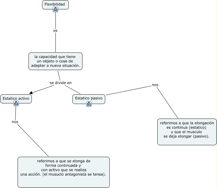 Este Cmap, tiene información relacionada con: flexibilidad, Flexibilidad es la capacidad que tiene un objeto o cosa de adaptar a nueva situación., la capacidad que tiene un objeto o cosa de adaptar a nueva situación. se divide en Estatico pasivo, la capacidad que tiene un objeto o cosa de adaptar a nueva situación. se divide en Estatico activo, Estatico pasivo nos referimos a que la elongación es continua (estatico) y que el musculo se deja elongar (pasivo)., Estatico activo nos referimos a que se elonga de forma continuada y con activo que se realiza una acción. (el musuclo antagonista se tensa).