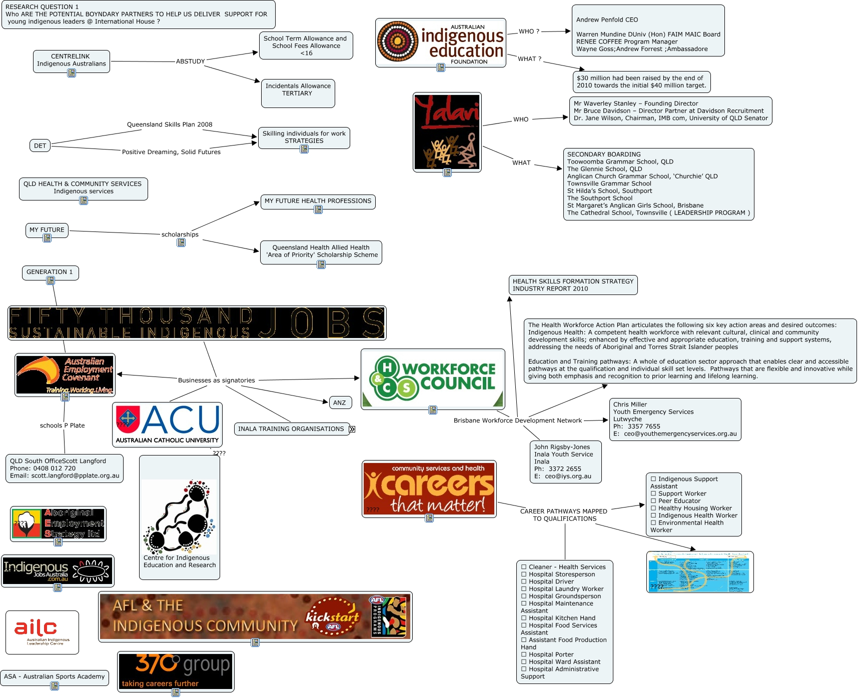 This Concept Map, created with IHMC CmapTools, has information related to: ATSI JOBS, ???? schools P Plate QLD South Office Scott Langford Phone: 0408 012 720 Email: scott.langford@pplate.org.au, CENTRELINK Indigenous Australians ABSTUDY School Term Allowance and School Fees Allowance ក, WHO ? Andrew Penfold CEO Warren Mundine DUniv (Hon) FAIM MAIC Board RENEE COFFEE Program Manager Wayne Goss;Andrew Forrest ;Ambassadore, WHAT ? $30 million had been raised by the end of 2010 towards the initial $40 million target., MY FUTURE scholarships MY FUTURE HEALTH PROFESSIONS, GENERATION 1 50,000 jobs ????, ???? CAREER PATHWAYS MAPPED TO QUALIFICATIONS ????, CENTRELINK Indigenous Australians ABSTUDY Incidentals Allowance TERTIARY, MY FUTURE scholarships Queensland Health Allied Health 'Area of Priority' Scholarship Scheme, ???? CAREER PATHWAYS MAPPED TO QUALIFICATIONS Cleaner - Health Services Hospital Storesperson Hospital Driver Hospital Laundry Worker Hospital Groundsperson Hospital Maintenance Assistant Hospital Kitchen Hand Hospital Food Services Assistant Assistant Food Production Hand Hospital Porter Hospital Ward Assistant Hospital Administrative Support, ???? WHAT SECONDARY BOARDING Toowoomba Grammar School, QLD The Glennie School, QLD Anglican Church Grammar School, ‘Churchie’ QLD Townsville Grammar School St Hilda’s School, Southport The Southport School St Margaret’s Anglican Girls School, Brisbane The Cathedral School, Townsville ( LEADERSHIP PROGRAM ), ???? Businesses as signatories, ???? Businesses as signatories ????, Brisbane Workforce Development Network The Health Workforce Action Plan articulates the following six key action areas and desired outcomes: Indigenous Health: A competent health workforce with relevant cultural, clinical and community development skills; enhanced by effective and appropriate education, training and support systems, addressing the needs of Aboriginal and Torres Strait Islander peoples Education and Training pathways: A whole of education sector approach that enables clear and accessible pathways at the qualification and individual skill set levels. Pathways that are flexible and innovative while giving both emphasis and recognition to prior learning and lifelong learning., Brisbane Workforce Development Network John Rigsby-Jones Inala Youth Service Inala Ph: 3372 2655 E: ceo@iys.org.au, ???? Businesses as signatories ????, ???? CAREER PATHWAYS MAPPED TO QUALIFICATIONS Indigenous Support Assistant Support Worker Peer Educator Healthy Housing Worker Indigenous Health Worker Environmental Health Worker, DET Positive Dreaming, Solid Futures Skilling individuals for work STRATEGIES, ???? Businesses as signatories INALA TRAINING ORGANISATIONS, DET Queensland Skills Plan 2008 Skilling individuals for work STRATEGIES