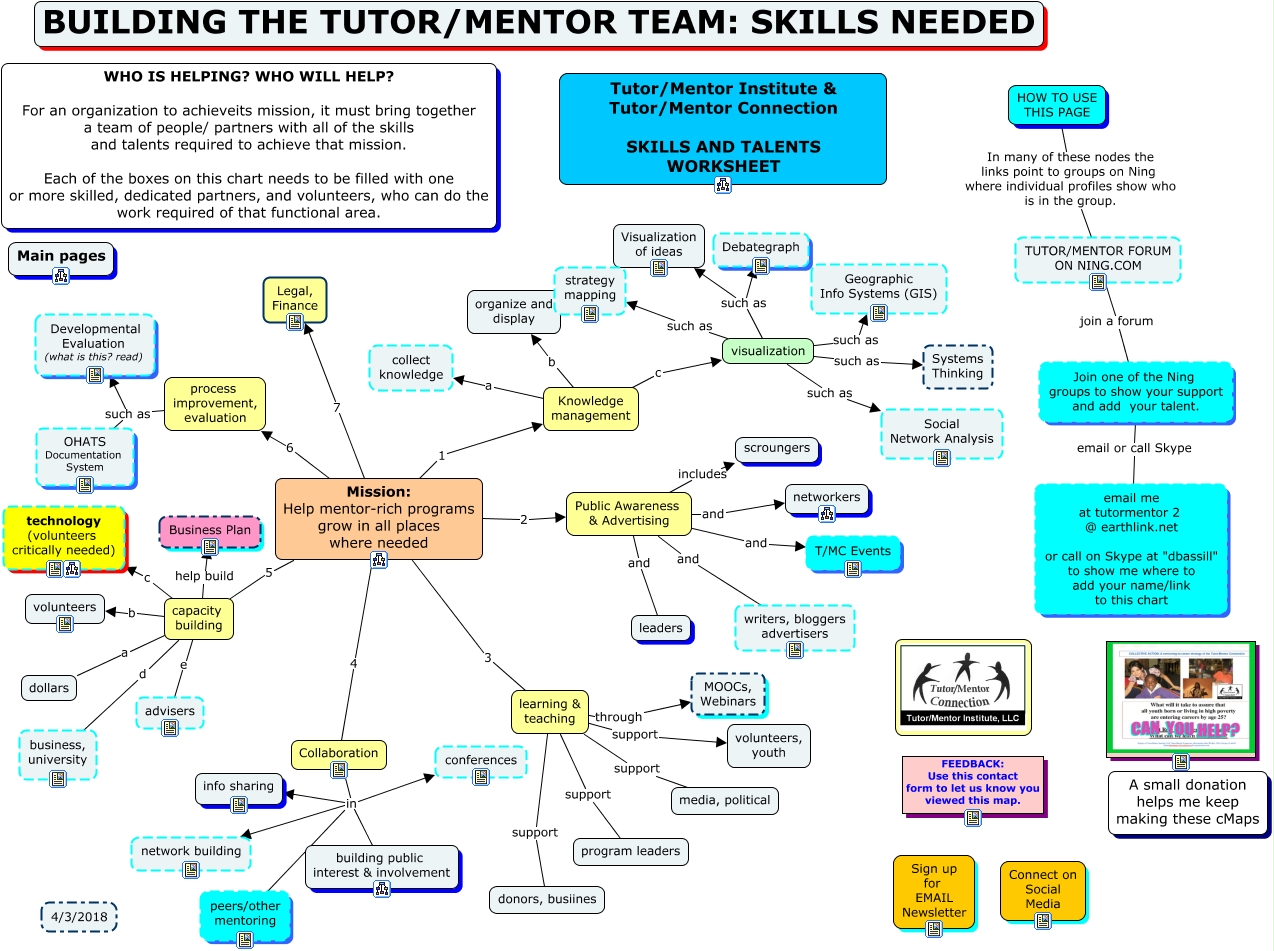 This Concept Map, created with IHMC CmapTools, has information related to: Tutor Mentor Institute Network Analysis - Skills, capacity building b volunteers, Mission: Help mentor-rich programs grow in all places where needed 3 learning & teaching, TUTOR/MENTOR FORUM ON NING.COM join a forum Join one of the Ning groups to show your support and add your talent., capacity building e advisers, Mission: Help mentor-rich programs grow in all places where needed 6 process improvement, evaluation, capacity building d business, university, Collaboration in network building, Join one of the Ning groups to show your support and add your talent. email or call Skype email me at tutormentor 2 @ earthlink.net or call on Skype at "dbassill" to show me where to add your name/link to this chart, Public Awareness & Advertising and T/MC Events, visualization such as Social Network Analysis, learning & teaching support media, political, capacity building a dollars, learning & teaching support program leaders, Knowledge management a collect knowledge, process improvement, evaluation such as OHATS Documentation System, capacity building help build Business Plan, visualization such as Geographic Info Systems (GIS), Knowledge management c visualization, Mission: Help mentor-rich programs grow in all places where needed 7 Legal, Finance, Collaboration in info sharing