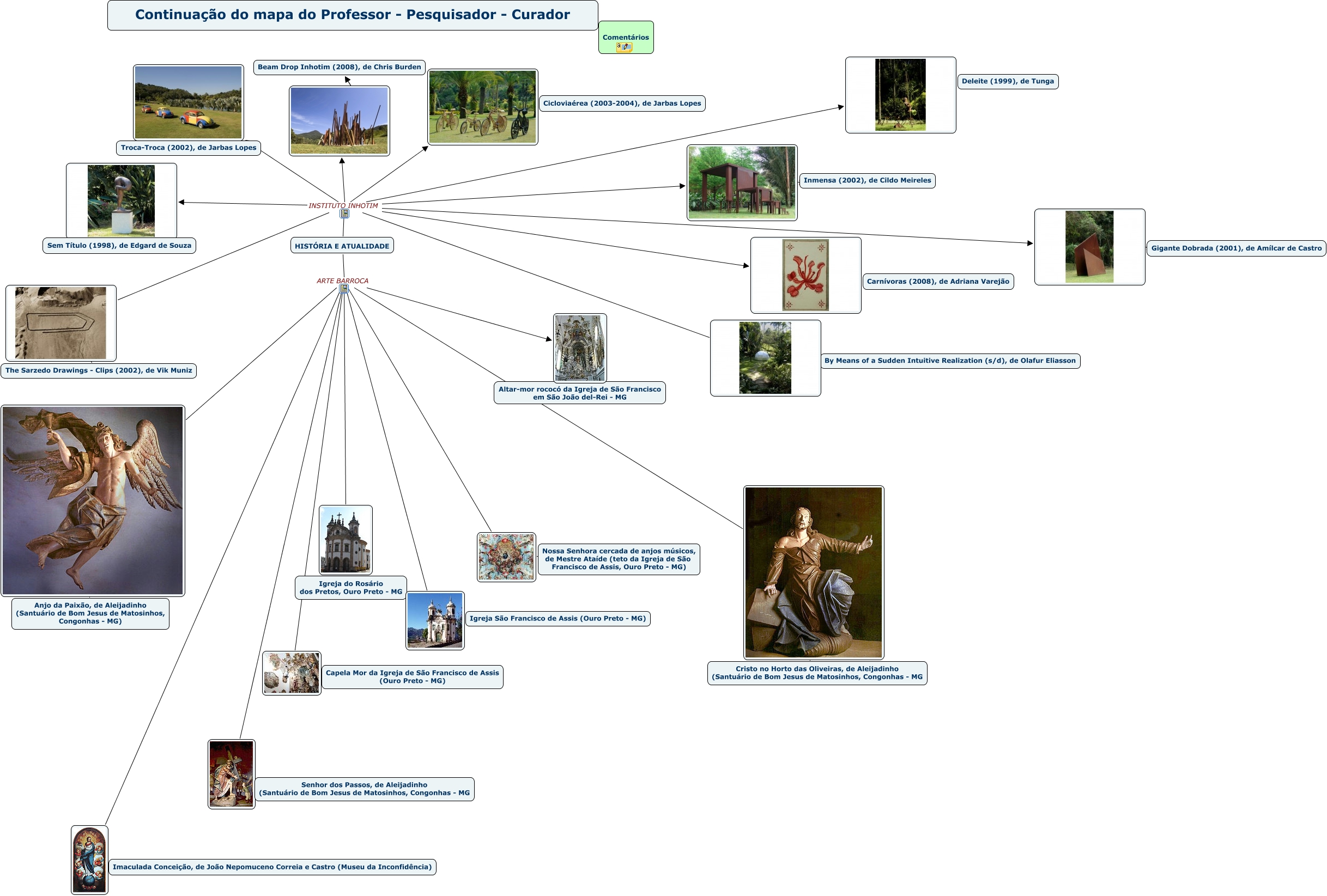 Esse mapa conceitual, produzido no IHMC CmapTools, tem a informação relacionada a: Continuação_Mapa Profº-pesquisador-curador-HISTÓRIA E ATUALIDADE, ???? By Means of a Sudden Intuitive Realization (s/d), de Olafur Eliasson, HISTÓRIA E ATUALIDADE INSTITUTO INHOTIM, ???? Nossa Senhora cercada de anjos músicos, de Mestre Ataíde (teto da Igreja de São Francisco de Assis, Ouro Preto - MG), HISTÓRIA E ATUALIDADE INSTITUTO INHOTIM, HISTÓRIA E ATUALIDADE INSTITUTO INHOTIM, ???? Senhor dos Passos, de Aleijadinho (Santuário de Bom Jesus de Matosinhos, Congonhas - MG, HISTÓRIA E ATUALIDADE ARTE BARROCA, HISTÓRIA E ATUALIDADE INSTITUTO INHOTIM, ???? Beam Drop Inhotim (2008), de Chris Burden, ???? Imaculada Conceição, de João Nepomuceno Correia e Castro (Museu da Inconfidência), ???? Troca-Troca (2002), de Jarbas Lopes, ???? Altar-mor rococó da Igreja de São Francisco em São João del-Rei - MG, ???? The Sarzedo Drawings - Clips (2002), de Vik Muniz, ???? Inmensa (2002), de Cildo Meireles, ???? Carnívoras (2008), de Adriana Varejão, HISTÓRIA E ATUALIDADE ARTE BARROCA, ???? Cicloviaérea (2003-2004), de Jarbas Lopes, ???? Beam Drop Inhotim (2008), de Chris Burden, HISTÓRIA E ATUALIDADE ARTE BARROCA, HISTÓRIA E ATUALIDADE INSTITUTO INHOTIM