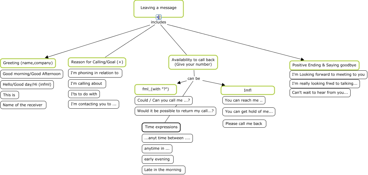 This Concept Map, created with IHMC CmapTools, has information related to: Leaving a message, Leaving a message includes Availability to call back (Give your number), Leaving a message includes Reason for Calling/Goal (+), Availability to call back (Give your number) can be Imfl, Availability to call back (Give your number) can be Time expressions, Availability to call back (Give your number) can be fml_(with "?"), Leaving a message includes Positive Ending & Saying goodbye, Leaving a message includes Greeting (name,company)