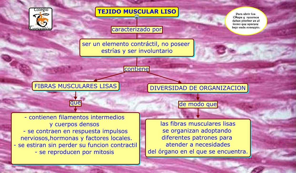 Este Cmap, tiene información relacionada con: TEJIDO MUSCULAR LISO, ser un elemento contráctil, no poseer estrías y ser involuntario contiene DIVERSIDAD DE ORGANIZACION, FIBRAS MUSCULARES LISAS que - contienen filamentos intermedios y cuerpos densos - se contraen en respuesta impulsos nerviosos,hormonas y factores locales. - se estiran sin perder su funcion contractil - se reproducen por mitosis, DIVERSIDAD DE ORGANIZACION de modo que las fibras musculares lisas se organizan adoptando diferentes patrones para atender a necesidades del órgano en el que se encuentra., TEJIDO MUSCULAR LISO caracterizado por ser un elemento contráctil, no poseer estrías y ser involuntario, ser un elemento contráctil, no poseer estrías y ser involuntario contiene FIBRAS MUSCULARES LISAS