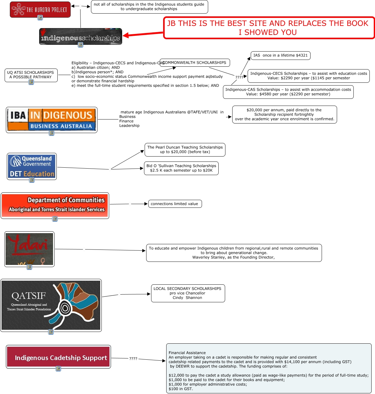 This Concept Map, created with IHMC CmapTools, has information related to: atsi tertiary scholarships, Bid O 'Sullivan Teaching Scholarships $2.5 K each semester up to $20K, mature age Indigenous Australians @TAFE/VET/UNI in Business Finance Leadership $20,000 per annum, paid directly to the Scholarship recipient fortnightly over the academic year once enrolment is confirmed.,, connections limited value, COMMONWEALTH SCHOLARSHIPS ???? Indigenous-CAS Scholarships – to assist with accommodation costs Value: $4580 per year ($2290 per semester), The Pearl Duncan Teaching Scholarships up to $20,000 (before tax), LOCAL SECONDARY SCHOLARSHIPS pro vice Chancellor Cindy Shannon, not all of scholarships in the the Indigenous students guide to undergraduate scholarships, UQ ATSI SCHOLARSHIPS A POSSIBLE PATHWAY Eligibility – Indigenous-CECS and Indigenous-CAS a) Australian citizen; AND b)Indigenous person*; AND c) low socio-economic status Commonwealth income support payment aqbstudy or demonstrate financial hardship e) meet the full-time student requirements specified in section 1.5 below; AND COMMONWEALTH SCHOLARSHIPS, COMMONWEALTH SCHOLARSHIPS ???? IAS once in a lifetime $4321, COMMONWEALTH SCHOLARSHIPS ???? Indigenous-CECS Scholarships – to assist with education costs Value: $2290 per year ($1145 per semester, To educate and empower Indigenous children from regional,rural and remote communities to bring about generational change. Waverley Stanley, as the Founding Director,, JB THIS IS THE BEST SITE AND REPLACES THE BOOK I SHOWED YOU, ???? Financial Assistance An employer taking on a cadet is responsible for making regular and consistent cadetship related payments to the cadet and is provided with $14,100 per annum (including GST) by DEEWR to support the cadetship. The funding comprises of: $12,000 to pay the cadet a study allowance (paid as wage-like payments) for the period of full-time study; $1,000 to be paid to the cadet for their books and equipment; $1,000 for employer administrative costs; $100 in GST.