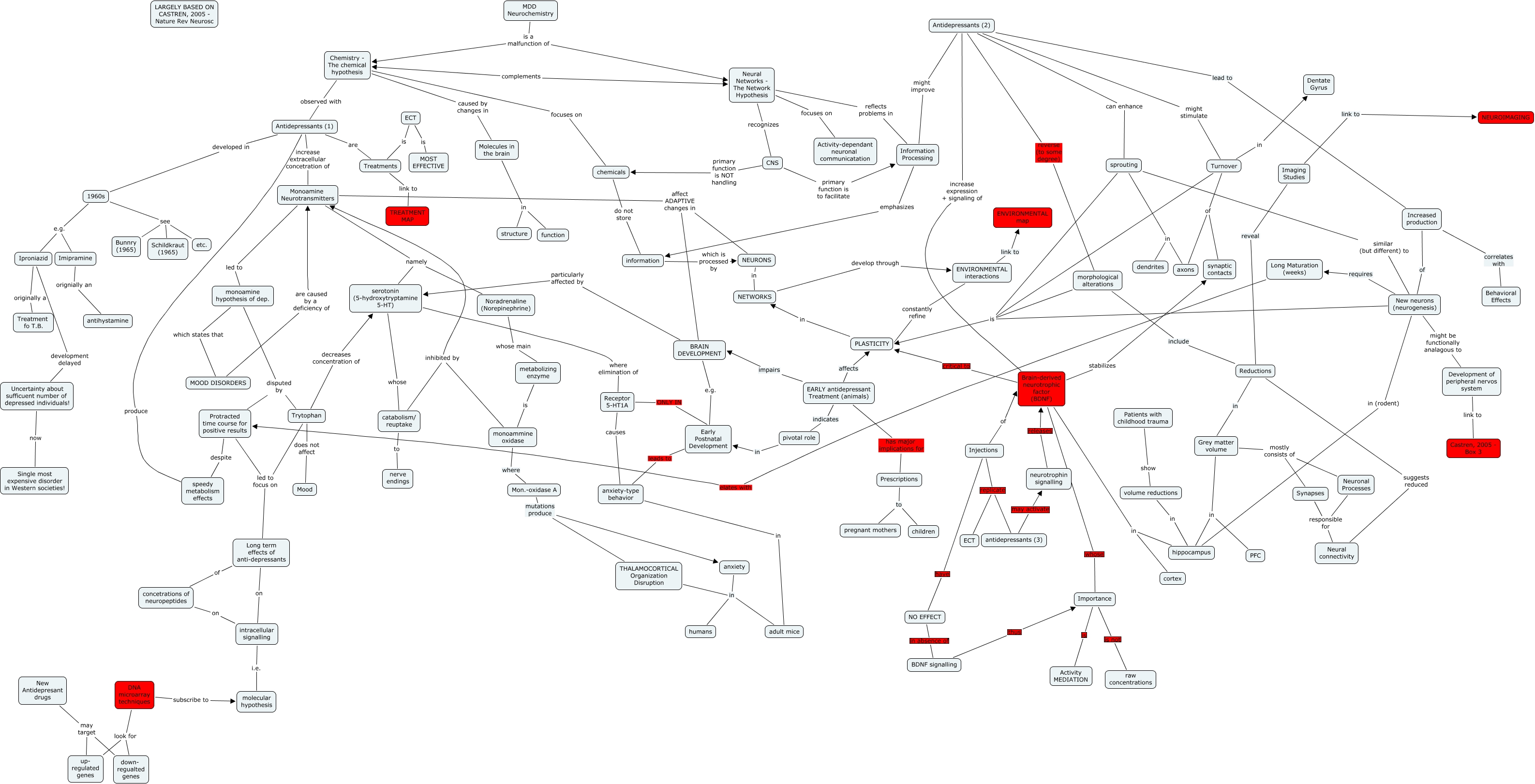 MDD neuro, Monoamine Neurotransmitters affect ADAPTIVE changes in NEURONS, monoamine hypothesis of dep. which states that MOOD DISORDERS, Injections have NO EFFECT, Synapses responsible for Neural connectivity, Antidepressants (1) increase extracellular concetration of Monoamine Neurotransmitters, sprouting in dendrites, ECT is Treatments, intracellular signalling i.e. molecular hypothesis, catabolism/ reuptake inhibited by Monoamine Neurotransmitters, DNA microarray techniques look for up- regulated genes