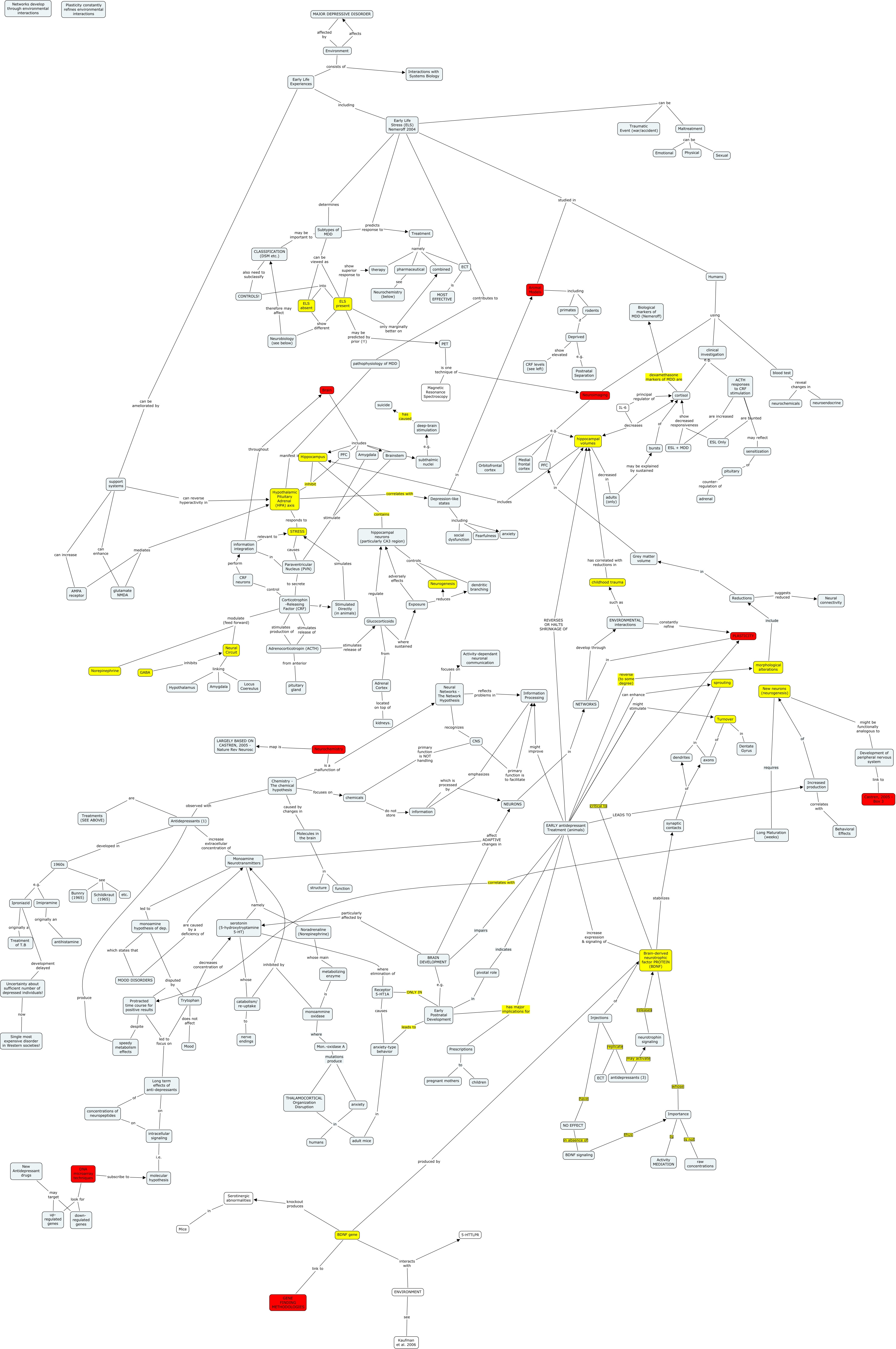 Reduced John's MDD, Chemistry - The chemical hypothesis caused by changes in Molecules in the brain, ESL + MDD show decreased responsiveness cortisol, Brain includes PFC, Maltreatment can be Sexual, CLASSIFICATION (DSM etc.) also need to subclassify CONTROLS!, Maltreatment can be Physical, Mon.-oxidase A mutations produce THALAMOCORTICAL Organization Disruption, subthalmic nuclei e.g. deep-brain stimulation, Early Life Experiences can be ameliorated by support systems, anxiety in adult mice