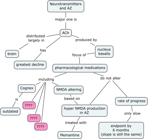 AZ neurotransmitters - JDN Rev, ACh has greatest decline, Neurotransmitters and AZ major one is ACh, ACh distributed largely in brain, pharmacological medications including NMDA altering, pharmacological medications do not alter rate of progress, Cognex is outdated, pharmacological medications including Cognex, nucleus basalis focus of pharmacological medications, rate of progress only slow endpoint by 6 months (slope is still the same), pharmacological medications including ????