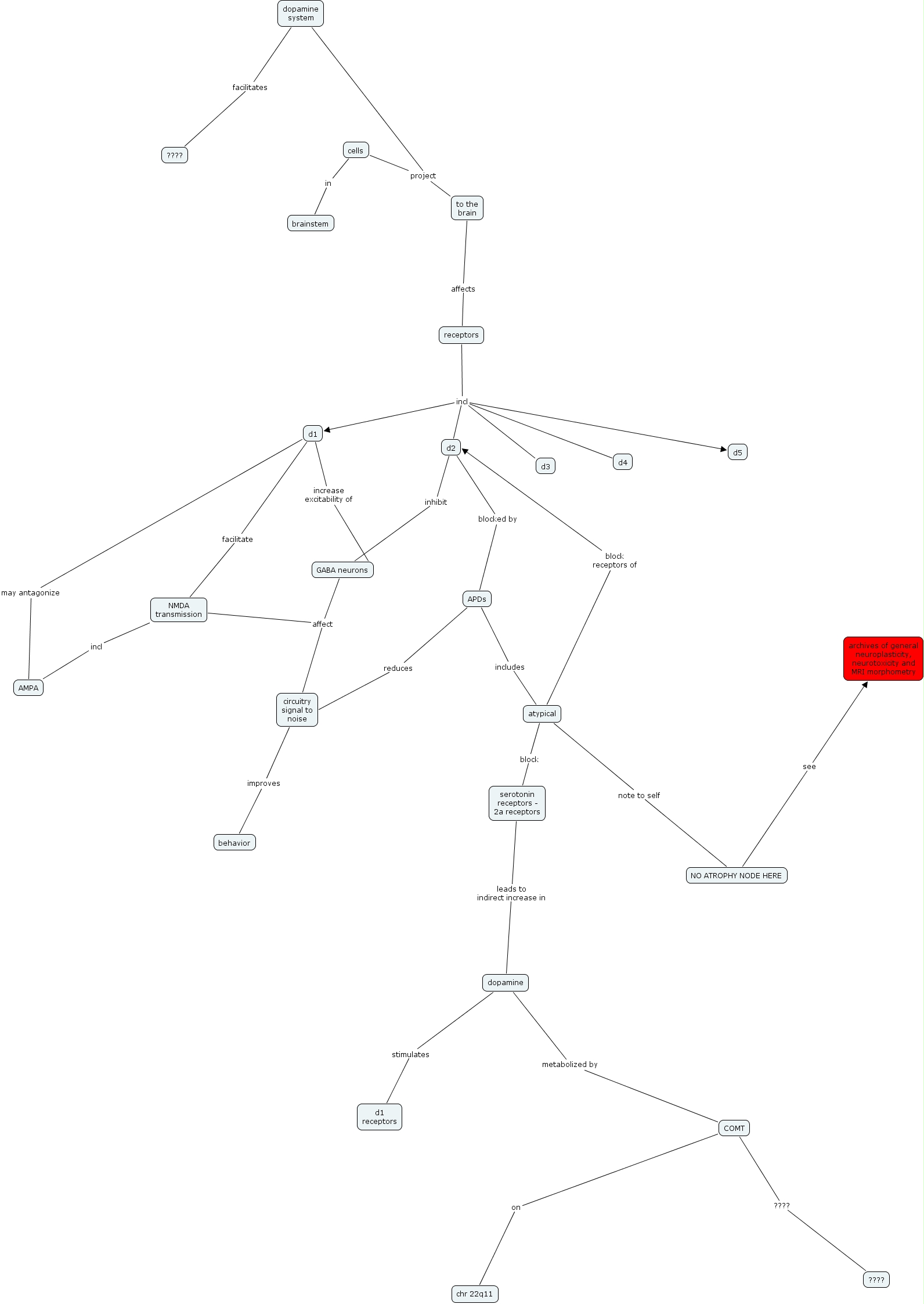 SZ genes1, receptors incl d5, COMT ???? ????, serotonin receptors - 2a receptors leads to indirect increase in dopamine, COMT on chr 22q11, d1 may antagonize AMPA, atypical block serotonin receptors - 2a receptors, NO ATROPHY NODE HERE see archives of general neuroplasticity, neurotoxicity and MRI morphometry, atypical note to self NO ATROPHY NODE HERE, to the brain affects receptors, d2 blocked by APDs