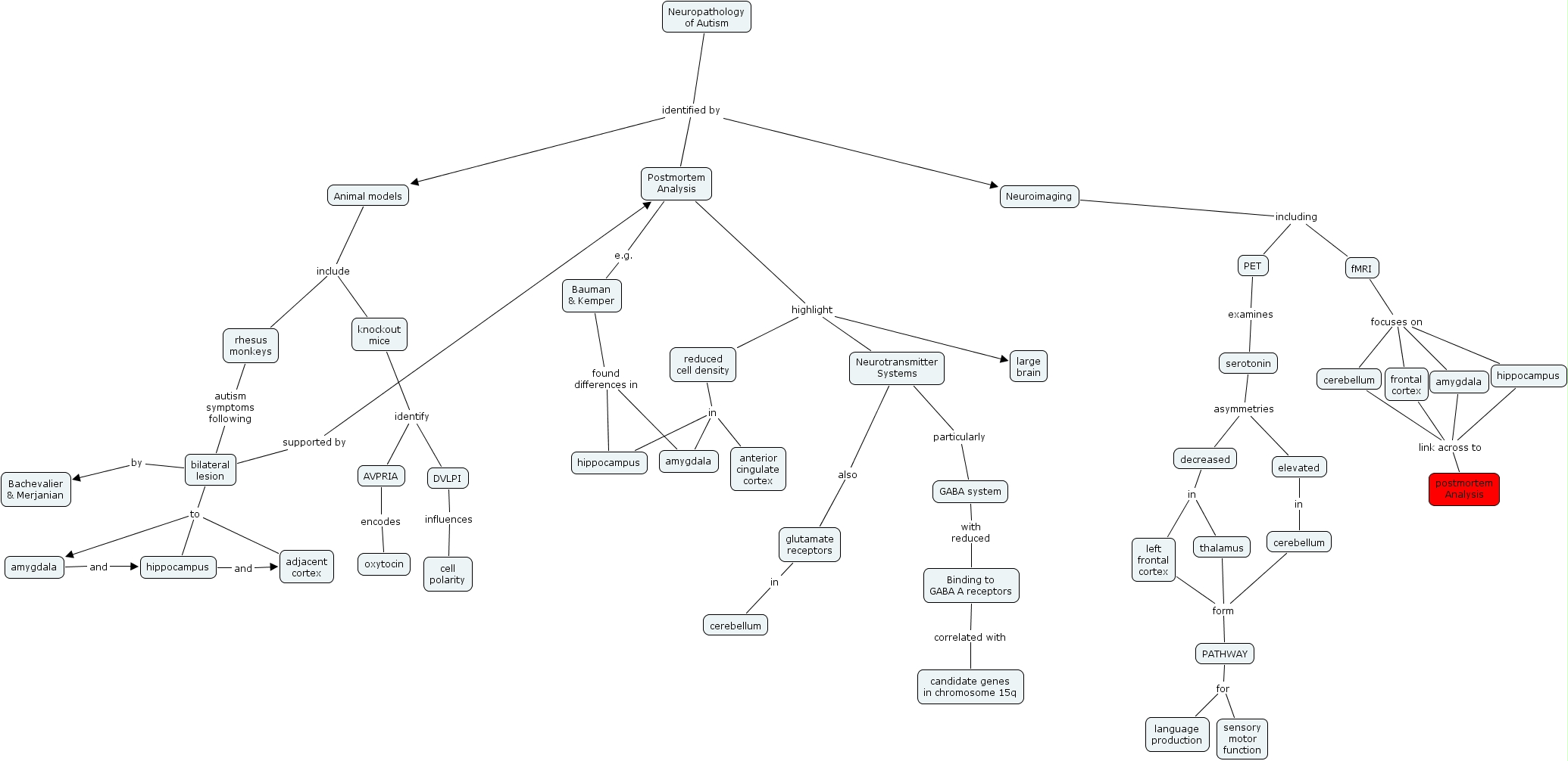 Autism Brain, glutamate receptors in cerebellum, Bauman & Kemper found differences in hippocampus, reduced cell density in amygdala, frontal cortex link across to postmortem Analysis, PET examines serotonin, PATHWAY for sensory motor function, fMRI focuses on amygdala, cerebellum link across to postmortem Analysis, bilateral lesion to amygdala, amygdala and hippocampus