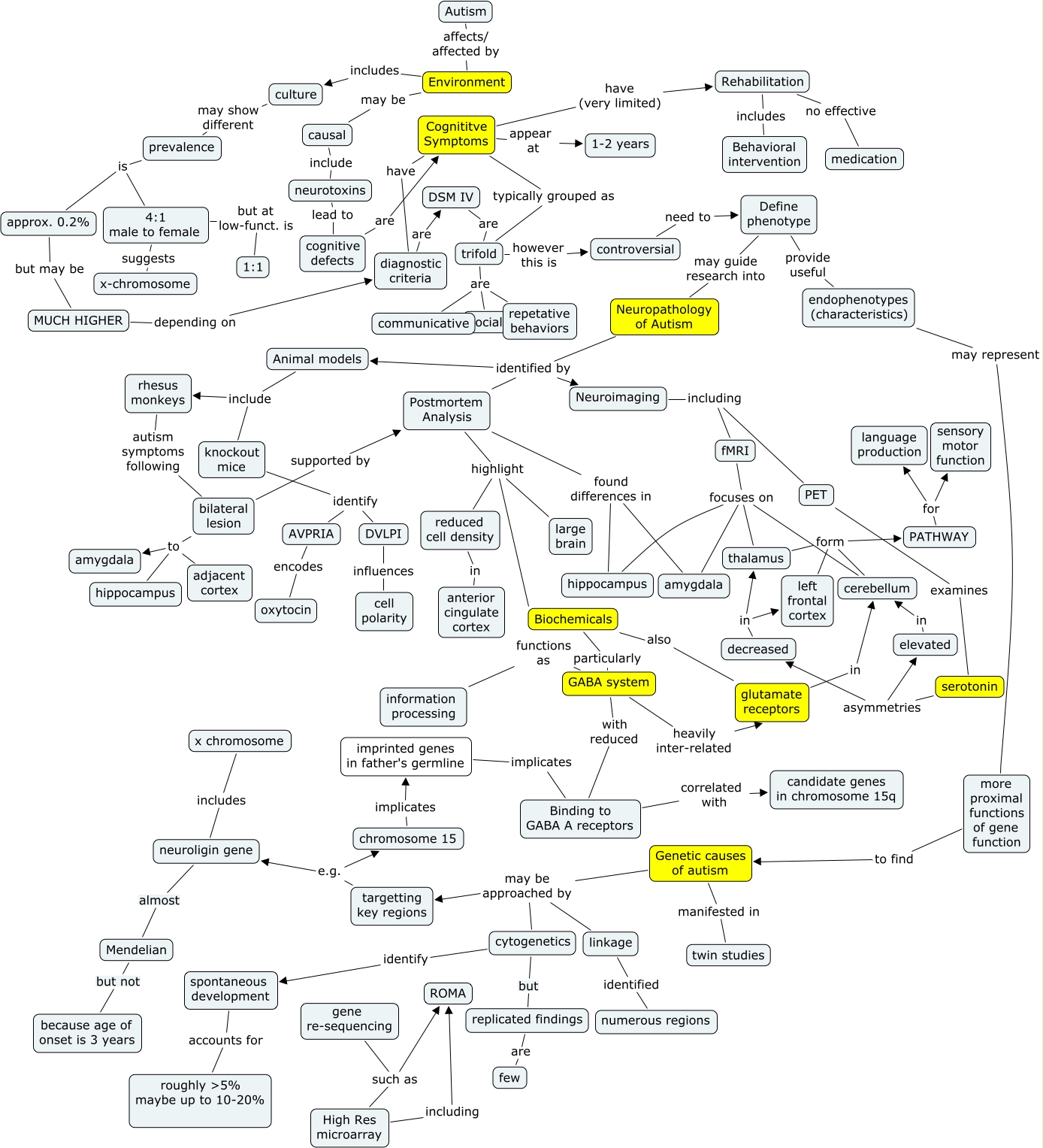 Autism Reduced - JDN Rev, fMRI focuses on cerebellum, Animal models include rhesus monkeys, diagnostic criteria are DSM IV, Neuroimaging including PET, 4:1 male to female but at low-funct. is 1:1, Biochemicals also glutamate receptors, approx. 0.2% but may be MUCH HIGHER, PET examines serotonin, PATHWAY for sensory motor function, PATHWAY for language production