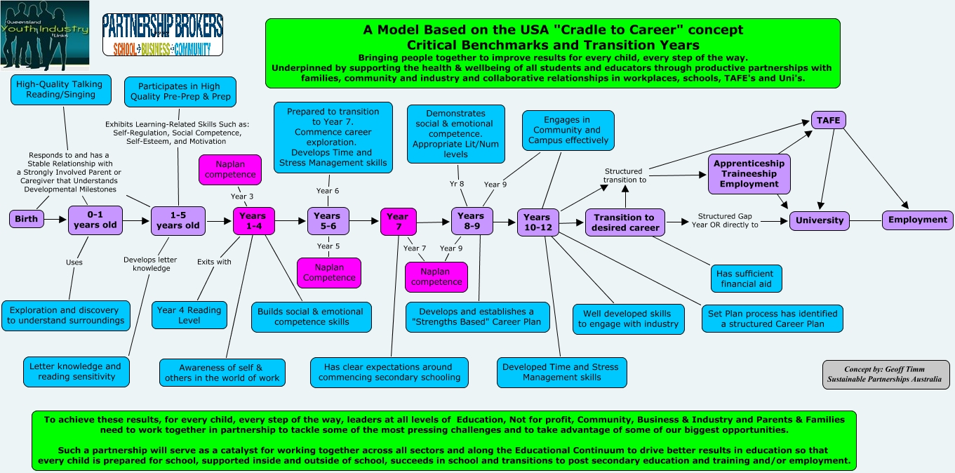 This Concept Map, created with IHMC CmapTools, has information related to: Critical Benchmarks and Transition Years, Transition to desired career Structured transition to TAFE, Years 8-9 ???? Years 10-12, 1-5 years old Exhibits Learning-Related Skills Such as: Self-Regulation, Social Competence, Self-Esteem, and Motivation Participates in High Quality Pre-Prep & Prep, Years 1-4 ???? Builds social & emotional competence skills, 0-1 years old ???? 1-5 years old, Birth ???? 0-1 years old, Years 5-6 Year 6 Prepared to transition to Year 7. Commence career exploration. Develops Time and Stress Management skills, 1-5 years old ???? Years 1-4, 1-5 years old Develops letter knowledge Letter knowledge and reading sensitivity, Years 1-4 Year 3 Naplan competence, Years 8-9 Yr 8 Demonstrates social & emotional competence. Appropriate Lit/Num levels, Apprenticeship Traineeship Employment ???? TAFE, 1-5 years old Responds to and has a Stable Relationship with a Strongly Involved Parent or Caregiver that Understands Developmental Milestones High-Quality Talking Reading/Singing, Transition to desired career Structured Gap Year OR directly to University, Years 10-12 ???? Engages in Community and Campus effectively, Years 8-9 Year 9 Naplan competence, Year 7 ???? Years 8-9, Transition to desired career ???? Has sufficient financial aid, Transition to desired career Structured transition to Apprenticeship Traineeship Employment, Birth Responds to and has a Stable Relationship with a Strongly Involved Parent or Caregiver that Understands Developmental Milestones High-Quality Talking Reading/Singing