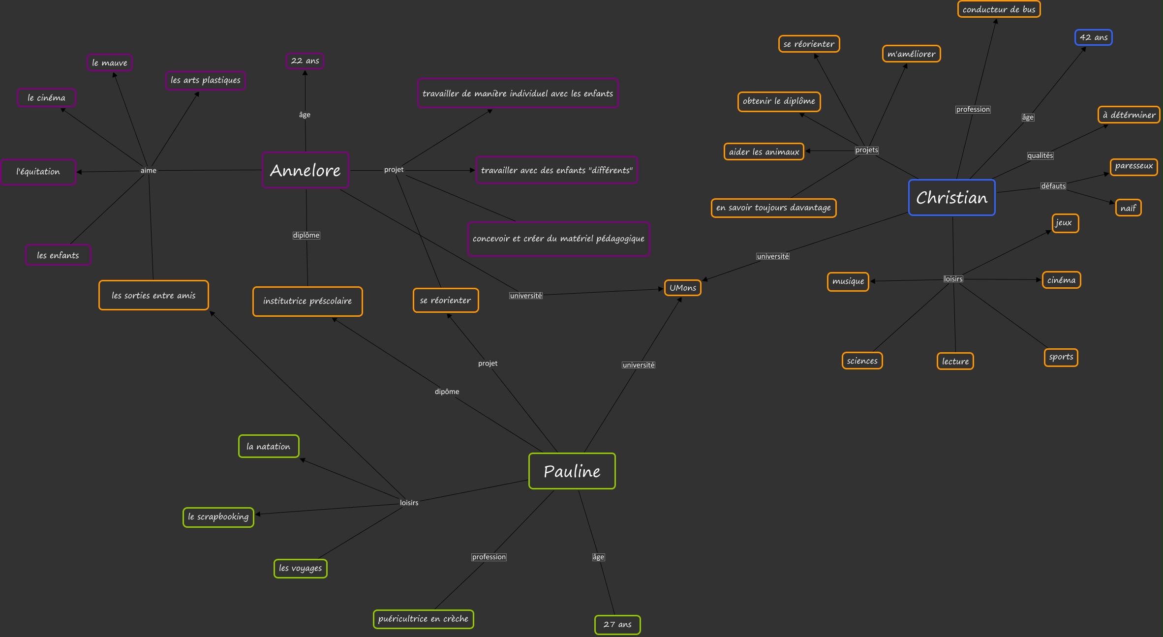 Cette carte de concepts créée avec IHMC CmapTools traite de: carte conceptuelle des profils 2, Annelore aime les enfants, Pauline profession puéricultrice en crèche, Pauline loisirs les sorties entre amis, Annelore aime l'équitation, Christian loisirs lecture, Christian projets aider les animaux, Pauline projet se réorienter, Annelore projet travailler de manière individuel avec les enfants, Pauline dipôme institutrice préscolaire, Christian qualités à détérminer, Annelore projet se réorienter, Pauline loisirs la natation, Annelore aime les arts plastiques, Annelore aime les sorties entre amis, Christian loisirs jeux, Christian projets obtenir le diplôme, Annelore aime le cinéma, Annelore aime le mauve, Christian loisirs sports, Pauline âge 27 ans