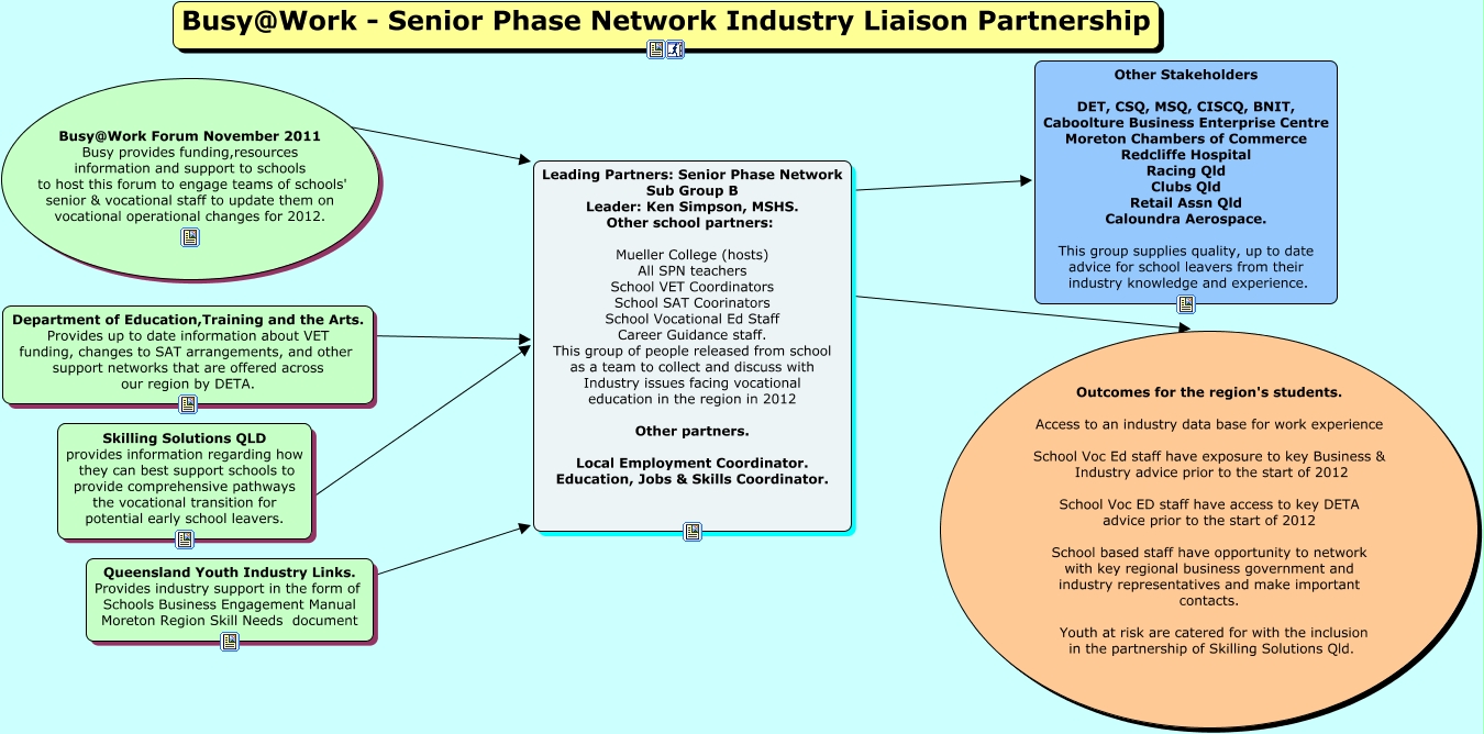 This Concept Map, created with IHMC CmapTools, has information related to: Busy DETA Industry Liaison Partnership, Busy@Work Forum November 2011 Busy provides funding,resources information and support to schools to host this forum to engage teams of schools' senior & vocational staff to update them on vocational operational changes for 2012. ???? Leading Partners: Senior Phase Network Sub Group B Leader: Ken Simpson, MSHS. Other school partners: Mueller College (hosts) All SPN teachers School VET Coordinators School SAT Coorinators School Vocational Ed Staff Career Guidance staff. This group of people released from school as a team to collect and discuss with Industry issues facing vocational education in the region in 2012 Other partners. Local Employment Coordinator. Education, Jobs & Skills Coordinator., Leading Partners: Senior Phase Network Sub Group B Leader: Ken Simpson, MSHS. Other school partners: Mueller College (hosts) All SPN teachers School VET Coordinators School SAT Coorinators School Vocational Ed Staff Career Guidance staff. This group of people released from school as a team to collect and discuss with Industry issues facing vocational education in the region in 2012 Other partners. Local Employment Coordinator. Education, Jobs & Skills Coordinator. ???? Other Stakeholders DET, CSQ, MSQ, CISCQ, BNIT, Caboolture Business Enterprise Centre Moreton Chambers of Commerce Redcliffe Hospital Racing Qld Clubs Qld Retail Assn Qld Caloundra Aerospace. This group supplies quality, up to date advice for school leavers from their industry knowledge and experience., Skilling Solutions QLD provides information regarding how they can best support schools to provide comprehensive pathways the vocational transition for potential early school leavers. ???? Leading Partners: Senior Phase Network Sub Group B Leader: Ken Simpson, MSHS. Other school partners: Mueller College (hosts) All SPN teachers School VET Coordinators School SAT Coorinators School Vocational Ed Staff Career Guidance staff. This group of people released from school as a team to collect and discuss with Industry issues facing vocational education in the region in 2012 Other partners. Local Employment Coordinator. Education, Jobs & Skills Coordinator., Department of Education,Training and the Arts. Provides up to date information about VET funding, changes to SAT arrangements, and other support networks that are offered across our region by DETA. ???? Leading Partners: Senior Phase Network Sub Group B Leader: Ken Simpson, MSHS. Other school partners: Mueller College (hosts) All SPN teachers School VET Coordinators School SAT Coorinators School Vocational Ed Staff Career Guidance staff. This group of people released from school as a team to collect and discuss with Industry issues facing vocational education in the region in 2012 Other partners. Local Employment Coordinator. Education, Jobs & Skills Coordinator., Leading Partners: Senior Phase Network Sub Group B Leader: Ken Simpson, MSHS. Other school partners: Mueller College (hosts) All SPN teachers School VET Coordinators School SAT Coorinators School Vocational Ed Staff Career Guidance staff. This group of people released from school as a team to collect and discuss with Industry issues facing vocational education in the region in 2012 Other partners. Local Employment Coordinator. Education, Jobs & Skills Coordinator. ???? Outcomes for the region's students. Access to an industry data base for work experience School Voc Ed staff have exposure to key Business & Industry advice prior to the start of 2012 School Voc ED staff have access to key DETA advice prior to the start of 2012 School based staff have opportunity to network with key regional business government and industry representatives and make important contacts. Youth at risk are catered for with the inclusion in the partnership of Skilling Solutions Qld., Queensland Youth Industry Links. Provides industry support in the form of Schools Business Engagement Manual Moreton Region Skill Needs document ???? Leading Partners: Senior Phase Network Sub Group B Leader: Ken Simpson, MSHS. Other school partners: Mueller College (hosts) All SPN teachers School VET Coordinators School SAT Coorinators School Vocational Ed Staff Career Guidance staff. This group of people released from school as a team to collect and discuss with Industry issues facing vocational education in the region in 2012 Other partners. Local Employment Coordinator. Education, Jobs & Skills Coordinator.