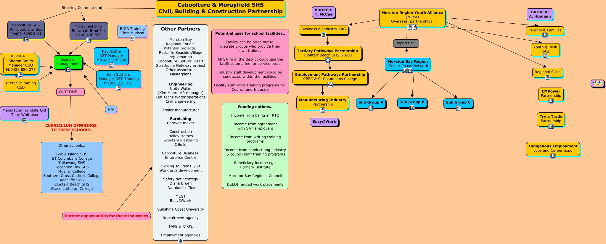 This Concept Map, created with IHMC CmapTools, has information related to: Caboolture & MorayfieldCivil Building & Construction Partnership, HIA ????, Moreton Bay Region Senior Phase Network ???? Sub Group C, Moreton Bay Region Senior Phase Network ???? Sub Group A, OUTCOME ... CURRICULUM OFFERINGS TO THESE SCHOOLS Other schools.. Bribie Island SHS ST Columbans College Tullawong SHS Deception Bay SHS Mueller College Southern Cross Catholic College Redcliffe SHS Clontarf Beach SHS Grace Lutheran College, Moreton Bay Region Senior Phase Network ???? Sub Group B, Business & Industry KAG ???? Tertiary Pathways Partnership Clontarf Beach SHS & ACU, Moreton Bay Region Senior Phase Network ???? Reports at.., Morayfield SHS Principal: Brad Fox 0400 436 872 ???? Board of management, Moreton Region Youth Alliance (MRYA) Oversees partnerships ???? Parents & Families, Caboolture & Morayfield SHS Civil, Building & Construction Partnership Steering Committee Morayfield SHS Principal: Brad Fox 0400 436 872, Brett Schimming CEO ????, Moreton Region Youth Alliance (MRYA) Oversees partnerships ???? Youth @ Risk KAG, Moreton Region Youth Alliance (MRYA) Oversees partnerships ???? Business & Industry KAG, Employment Pathways Partnership CBEC & St Columbans College ???? Manufacturing Industry Partnership, Caboolture SHS Principal: JIm Box Ph:(07) 5498 0111 ???? Board of management, Moreton Region Youth Alliance (MRYA) Oversees partnerships ???? Regional Skills, Caboolture & Morayfield SHS Civil, Building & Construction Partnership Steering Committee ????, Rod Esk Project manager CSQ M: 0448 855 870 ???? Board of management, Tertiary Pathways Partnership Clontarf Beach SHS & ACU ???? Employment Pathways Partnership CBEC & St Columbans College, Partner opportunities for these industries Other Partners Moreton Bay Regional Council Potential projects.. Redcliffe Seaside Village rejuvenation Caboolture Cultural Heart Strathpine Gateway project Other associated Masterplans Engineering Unity Water (Kim Moore HR manager) Lab Techs,Water operations Civil Engineering Trailer manufacturer Furnishing Caravan maker Construction Halley Homes Scooters Plastering QBuild Caboolture Business Enterprise Centre Skilling solutions QLD Workforce development Safety net Strategy Diana Bruen Nambour office MEGT Busy@Work Sunshine Coast University Recruitment agency TAFE & RTO's Employment agencies