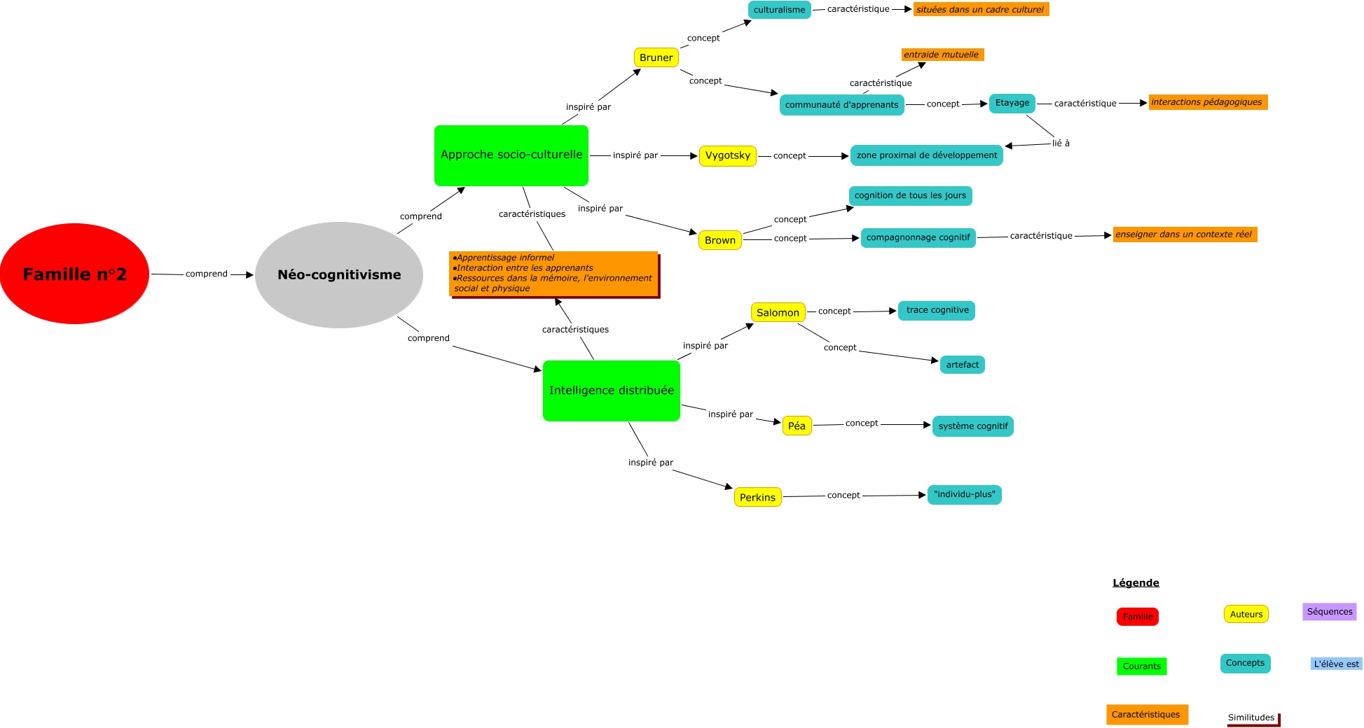 Cette carte de concepts créée avec IHMC CmapTools traite de: famille 2, Néo-cognitivisme comprend Approche socio-culturelle, Bruner concept culturalisme, Intelligence distribuée inspiré par Perkins, Etayage caractéristique interactions pédagogiques, Bruner concept communauté d'apprenants, Approche socio-culturelle inspiré par Brown, Intelligence distribuée inspiré par Péa, Péa concept système cognitif, Famille n°2 comprend Néo-cognitivisme, Brown concept compagnonnage cognitif, Salomon concept trace cognitive, Brown concept cognition de tous les jours, Perkins concept "individu-plus", Vygotsky concept zone proximal de développement, Approche socio-culturelle inspiré par Vygotsky, communauté d'apprenants caractéristique entraide mutuelle, Intelligence distribuée caractéristiques ∙Apprentissage informel ∙Interaction entre les apprenants ∙Ressources dans la mémoire, l'environnement social et physique, Approche socio-culturelle caractéristiques ∙Apprentissage informel ∙Interaction entre les apprenants ∙Ressources dans la mémoire, l'environnement social et physique, culturalisme caractéristique situées dans un cadre culturel, Néo-cognitivisme comprend Intelligence distribuée