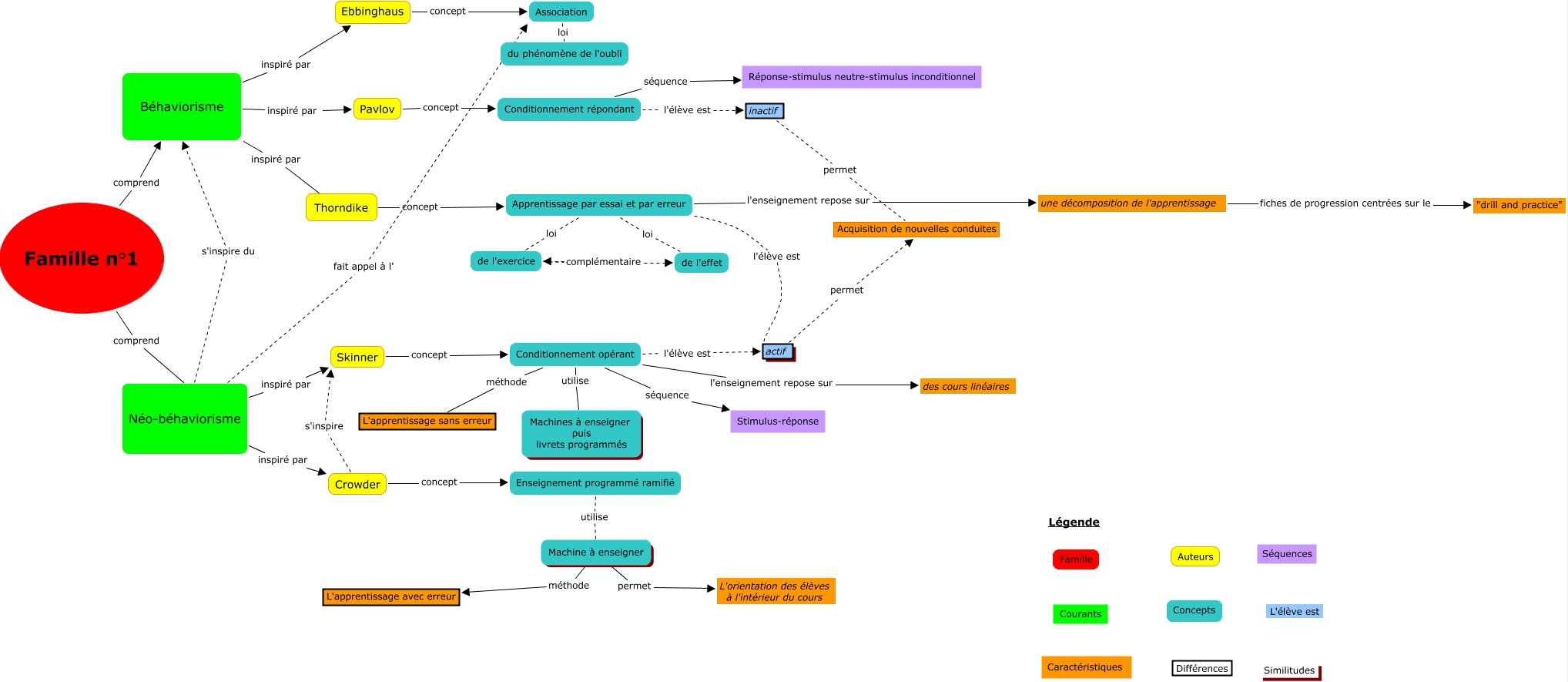 Cette carte de concepts créée avec IHMC CmapTools traite de: famille 1, Béhaviorisme inspiré par Pavlov, Conditionnement opérant séquence Stimulus-réponse, Machine à enseigner permet L'orientation des élèves à l'intérieur du cours, Néo-béhaviorisme inspiré par Crowder, Enseignement programmé ramifié utilise Machine à enseigner, Néo-béhaviorisme s'inspire du Béhaviorisme, Thorndike concept Apprentissage par essai et par erreur, Béhaviorisme inspiré par ????, Association loi du phénomène de l'oubli, Néo-béhaviorisme fait appel à l' Association, Apprentissage par essai et par erreur l'enseignement repose sur une décomposition de l'apprentissage, Conditionnement opérant l'élève est actif, Apprentissage par essai et par erreur l'élève est actif, Conditionnement répondant l'élève est inactif, Skinner concept Conditionnement opérant, inactif permet Acquisition de nouvelles conduites, Néo-béhaviorisme inspiré par Skinner, Crowder s'inspire Skinner, Crowder concept Enseignement programmé ramifié, Apprentissage par essai et par erreur loi de l'effet