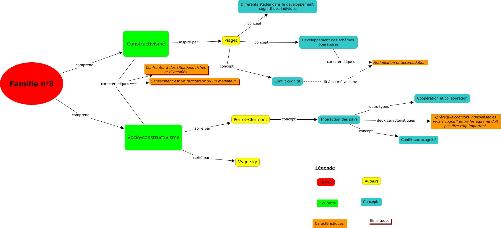 Cette carte de concepts créée avec IHMC CmapTools traite de: famille 3, Piaget concept Conflit cognitif, Constructivisme caractéristiques Confronter à des situations riches et diversifiés, Constructivisme caractéristiques L'enseignant est un facilitateur ou un médiateur, Piaget concept Différents stades dans le développement cognitif des individus, Socio-constructivisme inspiré par Perret-Clermont, Interaction des pairs concept Conflit sociocognitif, Socio-constructivisme caractéristiques Confronter à des situations riches et diversifiés, Développement des schèmes opératoires caractéristiques Assimilation et accomodation, Famille n°3 comprend Socio-constructivisme, Interaction des pairs deux types Coopération et collaboration, Perret-Clermont concept Interaction des pairs, Socio-constructivisme inspiré par Vygotsky, Conflit cognitif dû à ce mécanisme Assimilation et accomodation, Socio-constructivisme caractéristiques L'enseignant est un facilitateur ou un médiateur, Famille n°3 comprend Constructivisme, Interaction des pairs deux caractéristiques ∙prérequis cognitifs indispensables ∙écart cognitif entre les pairs ne doit pas être trop important, Piaget concept Développement des schèmes opératoires, Constructivisme inspiré par Piaget