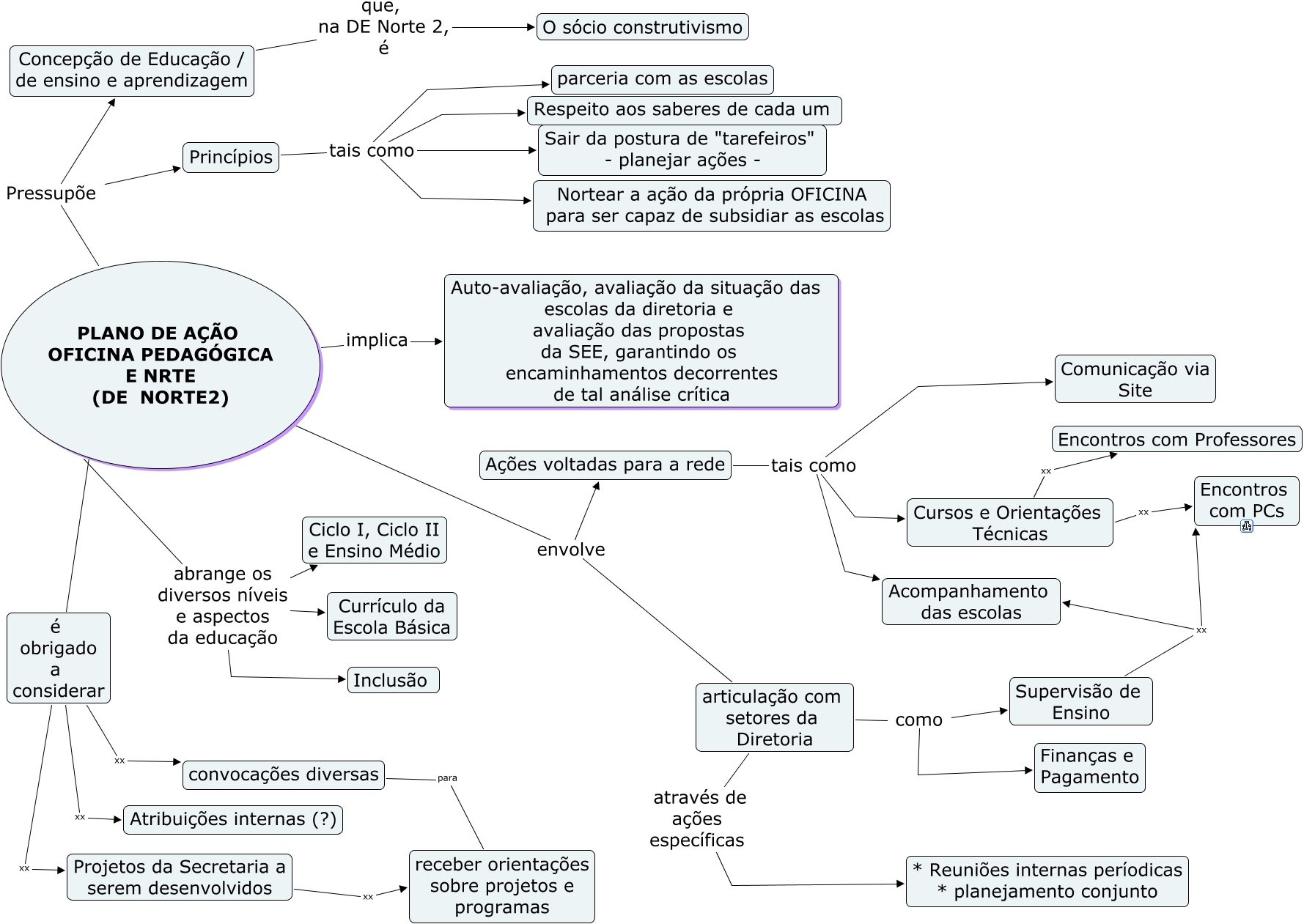 Esse mapa conceitual, produzido no IHMC CmapTools, tem a informação relacionada a: Plano Oficina Pedagógica (sugestão), PLANO DE AÇÃO OFICINA PEDAGÓGICA E NRTE (DE NORTE2) envolve Ações voltadas para a rede, Supervisão de Ensino xx Encontros com PCs, PLANO DE AÇÃO OFICINA PEDAGÓGICA E NRTE (DE NORTE2) Pressupõe Princípios, Cursos e Orientações Técnicas xx Encontros com PCs, Cursos e Orientações Técnicas xx Encontros com Professores, Supervisão de Ensino xx Acompanhamento das escolas, é obrigado a considerar xx Atribuições internas (?), PLANO DE AÇÃO OFICINA PEDAGÓGICA E NRTE (DE NORTE2) implica Auto-avaliação, avaliação da situação das escolas da diretoria e avaliação das propostas da SEE, garantindo os encaminhamentos decorrentes de tal análise crítica, é obrigado a considerar xx Projetos da Secretaria a serem desenvolvidos, articulação com setores da Diretoria como Finanças e Pagamento, Princípios tais como Respeito aos saberes de cada um, Ações voltadas para a rede tais como Comunicação via Site, PLANO DE AÇÃO OFICINA PEDAGÓGICA E NRTE (DE NORTE2) ???? é obrigado a considerar, articulação com setores da Diretoria como Supervisão de Ensino, articulação com setores da Diretoria através de ações específicas * Reuniões internas períodicas * planejamento conjunto, PLANO DE AÇÃO OFICINA PEDAGÓGICA E NRTE (DE NORTE2) abrange os diversos níveis e aspectos da educação Ciclo I, Ciclo II e Ensino Médio, Concepção de Educação / de ensino e aprendizagem que, na DE Norte 2, é O sócio construtivismo, Princípios tais como Nortear a ação da própria OFICINA para ser capaz de subsidiar as escolas, Ações voltadas para a rede tais como Cursos e Orientações Técnicas, Princípios tais como parceria com as escolas