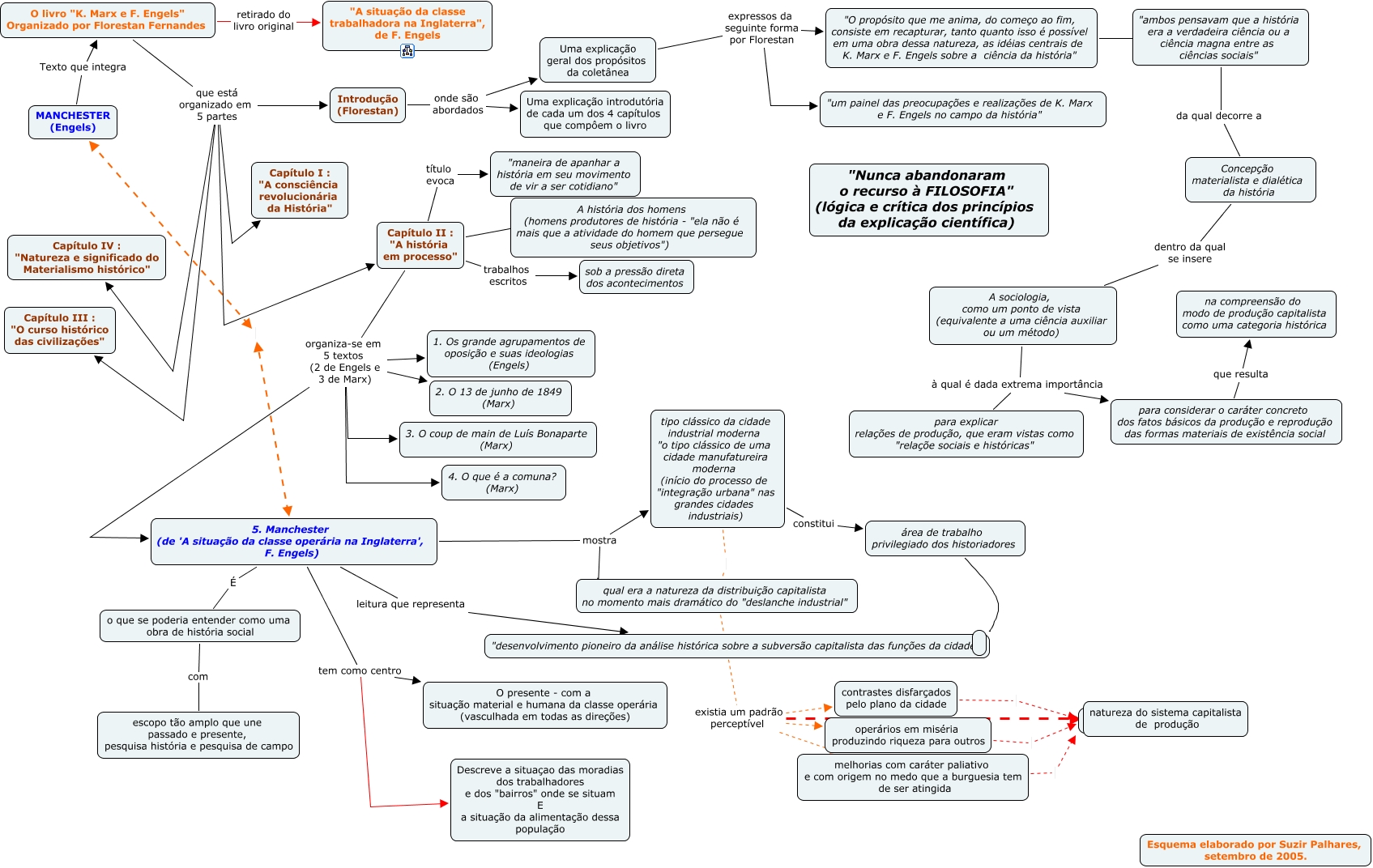 Esse mapa conceitual, produzido no IHMC CmapTools, tem a informação relacionada a: MANCHESTER, 5. Manchester (de 'A situação da classe operária na Inglaterra', F. Engels) leitura que representa "desenvolvimento pioneiro da análise histórica sobre a subversão capitalista das funções da cidade", Capítulo II : "A história em processo" trabalhos escritos sob a pressão direta dos acontecimentos, A sociologia, como um ponto de vista (equivalente a uma ciência auxiliar ou um método) à qual é dada extrema importância para explicar relações de produção, que eram vistas como "relaçõe sociais e históricas", para considerar o caráter concreto dos fatos básicos da produção e reprodução das formas materiais de existência social que resulta na compreensão do modo de produção capitalista como uma categoria histórica, contrastes disfarçados pelo plano da cidade, Introdução (Florestan) onde são abordados Uma explicação geral dos propósitos da coletânea, O livro "K. Marx e F. Engels" Organizado por Florestan Fernandes que está organizado em 5 partes Capítulo II : "A história em processo", tipo clássico da cidade industrial moderna "o tipo clássico de uma cidade manufatureira moderna (início do processo de "integração urbana" nas grandes cidades industriais) qual era a natureza da distribuição capitalista no momento mais dramático do "deslanche industrial", 5. Manchester (de 'A situação da classe operária na Inglaterra', F. Engels) mostra qual era a natureza da distribuição capitalista no momento mais dramático do "deslanche industrial", tipo clássico da cidade industrial moderna "o tipo clássico de uma cidade manufatureira moderna (início do processo de "integração urbana" nas grandes cidades industriais) constitui área de trabalho privilegiado dos historiadores, Capítulo II : "A história em processo" organiza-se em 5 textos (2 de Engels e 3 de Marx) 3. O coup de main de Luís Bonaparte (Marx), Uma explicação geral dos propósitos da coletânea expressos da seguinte forma por Florestan "O propósito que me anima, do começo ao fim, consiste em recapturar, tanto quanto isso é possível em uma obra dessa natureza, as idéias centrais de K. Marx e F. Engels sobre a ciência da história", Capítulo II : "A história em processo" organiza-se em 5 textos (2 de Engels e 3 de Marx) 5. Manchester (de 'A situação da classe operária na Inglaterra', F. Engels), 5. Manchester (de 'A situação da classe operária na Inglaterra', F. Engels) É o que se poderia entender como uma obra de história social, Capítulo II : "A história em processo" organiza-se em 5 textos (2 de Engels e 3 de Marx) 1. Os grande agrupamentos de oposição e suas ideologias (Engels), Capítulo II : "A história em processo" é A história dos homens (homens produtores de história - "ela não é mais que a atividade do homem que persegue seus objetivos"), O livro "K. Marx e F. Engels" Organizado por Florestan Fernandes que está organizado em 5 partes Capítulo IV : "Natureza e significado do Materialismo histórico", qual era a natureza da distribuição capitalista no momento mais dramático do "deslanche industrial" existia um padrão perceptível operários em miséria produzindo riqueza para outros, O livro "K. Marx e F. Engels" Organizado por Florestan Fernandes que está organizado em 5 partes Capítulo I : "A consciência revolucionária da História", A sociologia, como um ponto de vista (equivalente a uma ciência auxiliar ou um método) à qual é dada extrema importância para considerar o caráter concreto dos fatos básicos da produção e reprodução das formas materiais de existência social