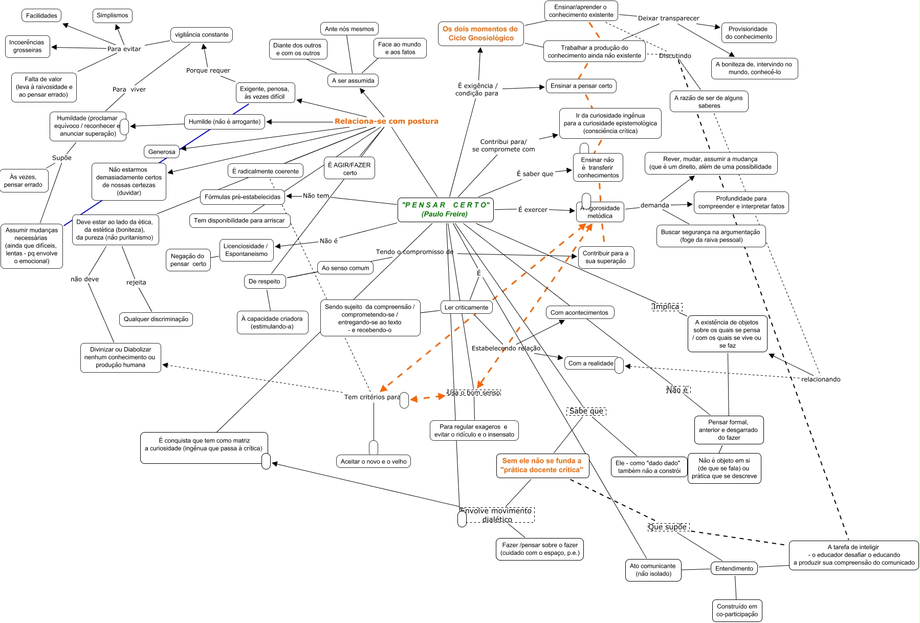 Esse mapa conceitual, produzido no IHMC CmapTools, tem a informação relacionada a: Pensar certo, A ser assumida ???? Face ao mundo e aos fatos, Os dois momentos do Ciclo Gnosiológico ???? Trabalhar a produção do conhecimento ainda não existente, "P E N S A R C E R T O" (Paulo Freire) É conquista que tem como matriz a curiosidade (ingênua que passa à crítica), "P E N S A R C E R T O" (Paulo Freire) É exercer A rigorosidade metódica, "P E N S A R C E R T O" (Paulo Freire) Sabe que Ele - como "dado dado" também não a constrói, "P E N S A R C E R T O" (Paulo Freire) Relaciona-se com postura É radicalmente coerente, A rigorosidade metódica demanda Buscar segurança na argumentação (foge da raiva pessoal), É radicalmente coerente, A rigorosidade metódica Usa o bom senso, "P E N S A R C E R T O" (Paulo Freire) Relaciona-se com postura De respeito, vigilância constante Para evitar Simplismos, "P E N S A R C E R T O" (Paulo Freire) É saber que Ensinar não é transferir conhecimentos, vigilância constante Para evitar Facilidades, Deve estar ao lado da ética, da estética (boniteza), da pureza (não puritanismo) rejeita Qualquer discriminação, Entendimento ???? A tarefa de inteligir - o educador desafiar o educando a produzir sua compreensão do comunicado, vigilância constante Para evitar Incoerências grosseiras, Entendimento ???? Ato comunicante (não isolado), "P E N S A R C E R T O" (Paulo Freire) Relaciona-se com postura Deve estar ao lado da ética, da estética (boniteza), da pureza (não puritanismo), Ensinar/aprender o conhecimento existente Deixar transparecer A boniteza de, intervindo no mundo, conhecê-lo, A existência de objetos sobre os quais se pensa / com os quais se vive ou se faz ???? Pensar formal, anterior e desgarrado do fazer