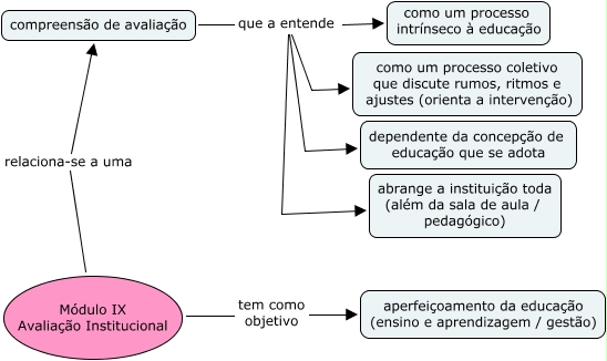 Esse mapa conceitual, produzido no IHMC CmapTools, tem a informação relacionada a: Avaliação Institucional, compreensão de avaliação que a entende abrange a instituição toda (além da sala de aula / pedagógico), Módulo IX Avaliação Institucional tem como objetivo aperfeiçoamento da educação (ensino e aprendizagem / gestão), compreensão de avaliação que a entende dependente da concepção de educação que se adota, compreensão de avaliação que a entende como um processo intrínseco à educação, Módulo IX Avaliação Institucional relaciona-se a uma compreensão de avaliação, compreensão de avaliação que a entende como um processo coletivo que discute rumos, ritmos e ajustes (orienta a intervenção)