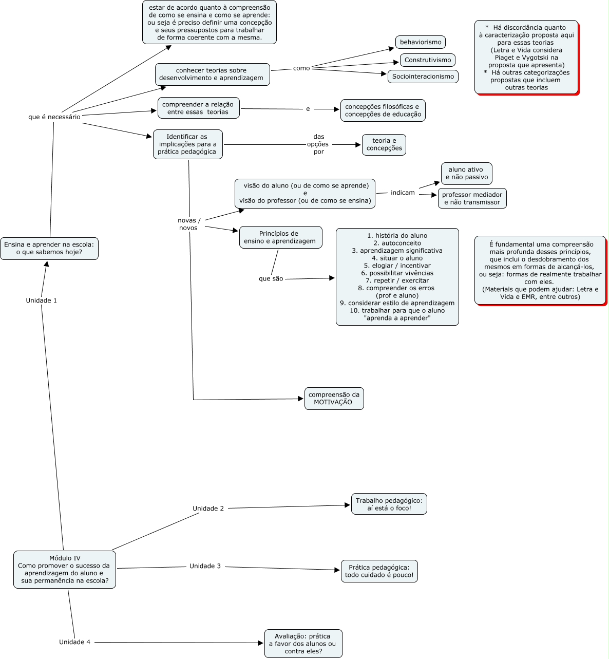 Esse mapa conceitual, produzido no IHMC CmapTools, tem a informação relacionada a: Como promover o sucesso da aprendizagem, conhecer teorias sobre desenvolvimento e aprendizagem como Sociointeracionismo, visão do aluno (ou de como se aprende) e visão do professor (ou de como se ensina) indicam aluno ativo e não passivo, Identificar as implicações para a prática pedagógica novas / novos visão do aluno (ou de como se aprende) e visão do professor (ou de como se ensina), Princípios de ensino e aprendizagem que são 1. história do aluno 2. autoconceito 3. aprendizagem significativa 4. situar o aluno 5. elogiar / incentivar 6. possibilitar vivências 7. repetir / exercitar 8. compreender os erros (prof e aluno) 9. considerar estilo de aprendizagem 10. trabalhar para que o aluno "aprenda a aprender", visão do aluno (ou de como se aprende) e visão do professor (ou de como se ensina) indicam professor mediador e não transmissor, conhecer teorias sobre desenvolvimento e aprendizagem como behaviorismo, Módulo IV Como promover o sucesso da aprendizagem do aluno e sua permanência na escola? Unidade 1 Ensina e aprender na escola: o que sabemos hoje?, Ensina e aprender na escola: o que sabemos hoje? que é necessário conhecer teorias sobre desenvolvimento e aprendizagem, Ensina e aprender na escola: o que sabemos hoje? que é necessário Identificar as implicações para a prática pedagógica, compreender a relação entre essas teorias e concepções filosóficas e concepções de educação, Módulo IV Como promover o sucesso da aprendizagem do aluno e sua permanência na escola? Unidade 2 Trabalho pedagógico: aí está o foco!, Ensina e aprender na escola: o que sabemos hoje? que é necessário estar de acordo quanto à compreensão de como se ensina e como se aprende: ou seja é preciso definir uma concepção e seus pressupostos para trabalhar de forma coerente com a mesma., Módulo IV Como promover o sucesso da aprendizagem do aluno e sua permanência na escola? Unidade 4 Avaliação: prática a favor dos alunos ou contra eles?, Módulo IV Como promover o sucesso da aprendizagem do aluno e sua permanência na escola? Unidade 3 Prática pedagógica: todo cuidado é pouco!, conhecer teorias sobre desenvolvimento e aprendizagem como Construtivismo, Identificar as implicações para a prática pedagógica novas / novos compreensão da MOTIVAÇÃO, Identificar as implicações para a prática pedagógica das opções por teoria e concepções, Identificar as implicações para a prática pedagógica novas / novos Princípios de ensino e aprendizagem, Ensina e aprender na escola: o que sabemos hoje? que é necessário compreender a relação entre essas teorias