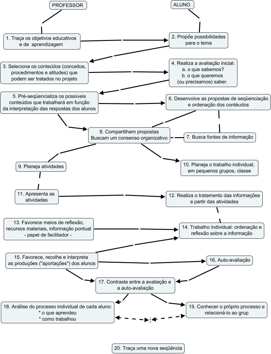 Esse mapa conceitual, produzido no IHMC CmapTools, tem a informação relacionada a: Seqüência-síntese das ações de professor e alunos no desenvolvimento do Projeto, 7. Busca fontes de informação 8. Compartilham propostas Buscam um consenso organizativo, 2. Propõe possibilidades para o tema 3. Seleciona os conteúdos (conceitos, procedimentos e atitudes) que podem ser tratados no projeto, 5. Pré-seqüencializa os possíveis conteúdos que trabalhará em função da interpretação das respostas dos alunos 6. Desenvolve as propostas de seqüenciação e ordenação dos contéudos, 13. Favorece meios de reflexão, recursos materiais, informação pontual - papel de facilitador - 14. Trabalho individual: ordenação e reflexão sobre a informação, 8. Compartilham propostas Buscam um consenso organizativo 10. Planeja o trabalho individual, em pequenos grupos, classe, 15. Favorece, recolhe e interpreta as produções ("aportações") dos alunos 16. Auto-avaliação, 12. Realiza o tratamento das informações a partir das atividades 14. Trabalho individual: ordenação e reflexão sobre a informação, 8. Compartilham propostas Buscam um consenso organizativo 9. Planeja atividades, 9. Planeja atividades 11. Apresenta as atividades, 1. Traça os objetivos educativos e de aprendizagem 2. Propõe possibilidades para o tema, 6. Desenvolve as propostas de seqüenciação e ordenação dos contéudos 7. Busca fontes de informação, 3. Seleciona os conteúdos (conceitos, procedimentos e atitudes) que podem ser tratados no projeto 4. Realiza a avaliação inicial: a. o que sabemos? b. o que queremos (ou precisamos) saber., PROFESSOR 1. Traça os objetivos educativos e de aprendizagem, 17. Contraste entre a avaliação e a auto-avaliação 19. Conhecer o próprio processo e relacioná-lo ao grup, 11. Apresenta as atividades 12. Realiza o tratamento das informações a partir das atividades, 4. Realiza a avaliação inicial: a. o que sabemos? b. o que queremos (ou precisamos) saber. 5. Pré-seqüencializa os possíveis conteúdos que trabalhará em função da interpretação das respostas dos alunos, 15. Favorece, recolhe e interpreta as produções ("aportações") dos alunos 17. Contraste entre a avaliação e a auto-avaliação, 18. Análise do processo individual de cada aluno: * o que aprendeu * como trabalhou 19. Conhecer o próprio processo e relacioná-lo ao grup, 16. Auto-avaliação 17. Contraste entre a avaliação e a auto-avaliação, 5. Pré-seqüencializa os possíveis conteúdos que trabalhará em função da interpretação das respostas dos alunos 8. Compartilham propostas Buscam um consenso organizativo
