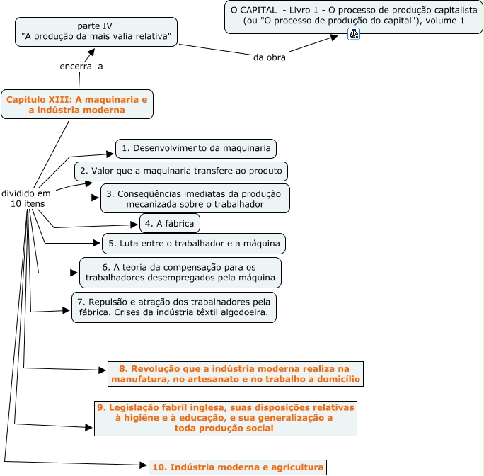 Esse mapa conceitual, produzido no IHMC CmapTools, tem a informação relacionada a: O Capital - A maquinaria e a indústria moderna, parte IV "A produção da mais valia relativa" da obra O CAPITAL - Livro 1 - O processo de produção capitalista (ou "O processo de produção do capital"), volume 1, Capítulo XIII: A maquinaria e a indústria moderna dividido em 10 itens 2. Valor que a maquinaria transfere ao produto, Capítulo XIII: A maquinaria e a indústria moderna dividido em 10 itens 3. Conseqüências imediatas da produção mecanizada sobre o trabalhador, Capítulo XIII: A maquinaria e a indústria moderna dividido em 10 itens 4. A fábrica, Capítulo XIII: A maquinaria e a indústria moderna dividido em 10 itens 5. Luta entre o trabalhador e a máquina, Capítulo XIII: A maquinaria e a indústria moderna dividido em 10 itens 6. A teoria da compensação para os trabalhadores desempregados pela máquina, Capítulo XIII: A maquinaria e a indústria moderna dividido em 10 itens 7. Repulsão e atração dos trabalhadores pela fábrica. Crises da indústria têxtil algodoeira., Capítulo XIII: A maquinaria e a indústria moderna dividido em 10 itens 10. Indústria moderna e agricultura, Capítulo XIII: A maquinaria e a indústria moderna dividido em 10 itens 1. Desenvolvimento da maquinaria, Capítulo XIII: A maquinaria e a indústria moderna dividido em 10 itens 8. Revolução que a indústria moderna realiza na manufatura, no artesanato e no trabalho a domicílio, Capítulo XIII: A maquinaria e a indústria moderna dividido em 10 itens 9. Legislação fabril inglesa, suas disposições relativas à higiêne e à educação, e sua generalização a toda produção social, Capítulo XIII: A maquinaria e a indústria moderna encerra a parte IV "A produção da mais valia relativa"