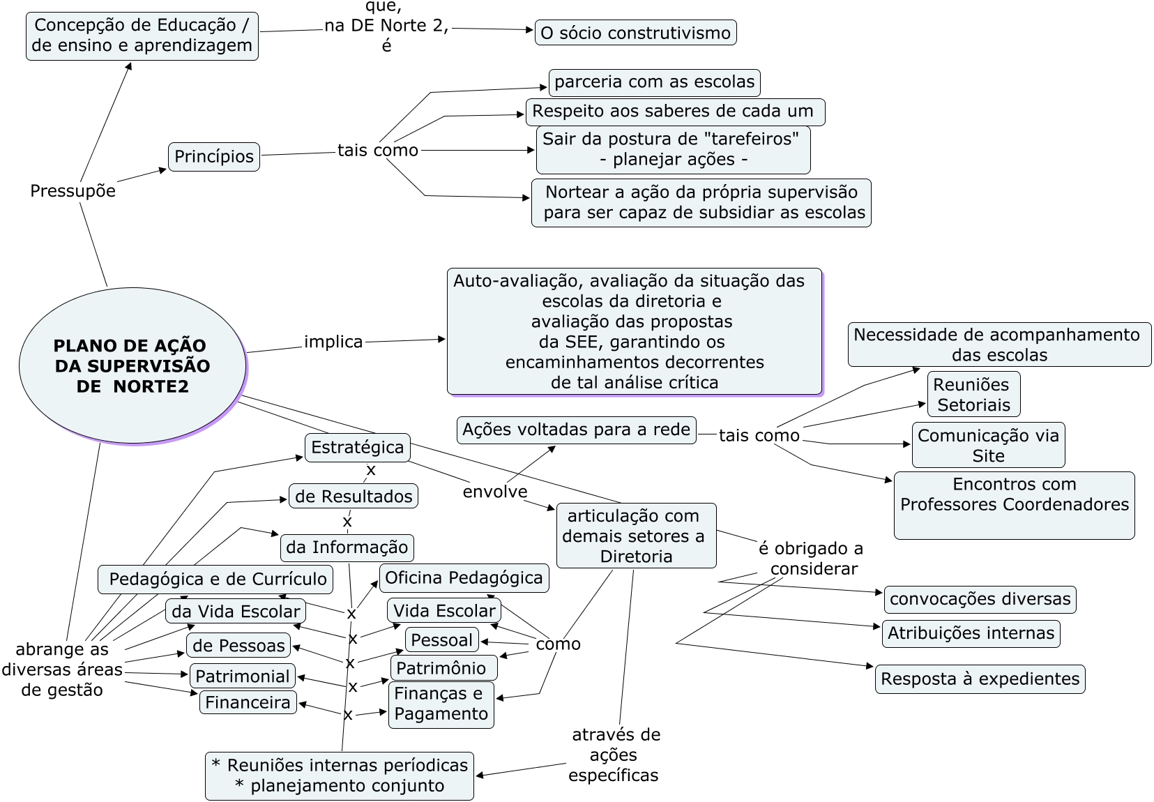 Esse mapa conceitual, produzido no IHMC CmapTools, tem a informação relacionada a: Plano da Supervisão (a), PLANO DE AÇÃO DA SUPERVISÃO DE NORTE2 abrange as diversas áreas de gestão Estratégica, Estratégica x de Resultados, articulação com demais setores a Diretoria como Finanças e Pagamento, articulação com demais setores a Diretoria como Patrimônio, articulação com demais setores a Diretoria como Oficina Pedagógica, Ações voltadas para a rede tais como Reuniões Setoriais, PLANO DE AÇÃO DA SUPERVISÃO DE NORTE2 Pressupõe Concepção de Educação / de ensino e aprendizagem, PLANO DE AÇÃO DA SUPERVISÃO DE NORTE2 é obrigado a considerar Resposta à expedientes, PLANO DE AÇÃO DA SUPERVISÃO DE NORTE2 implica Auto-avaliação, avaliação da situação das escolas da diretoria e avaliação das propostas da SEE, garantindo os encaminhamentos decorrentes de tal análise crítica, PLANO DE AÇÃO DA SUPERVISÃO DE NORTE2 abrange as diversas áreas de gestão da Vida Escolar, PLANO DE AÇÃO DA SUPERVISÃO DE NORTE2 abrange as diversas áreas de gestão Financeira, Princípios tais como Respeito aos saberes de cada um, PLANO DE AÇÃO DA SUPERVISÃO DE NORTE2 abrange as diversas áreas de gestão de Pessoas, PLANO DE AÇÃO DA SUPERVISÃO DE NORTE2 Pressupõe Princípios, Princípios tais como Sair da postura de "tarefeiros" - planejar ações -, da Informação x Pedagógica e de Currículo, da Informação x * Reuniões internas períodicas * planejamento conjunto, PLANO DE AÇÃO DA SUPERVISÃO DE NORTE2 é obrigado a considerar convocações diversas, articulação com demais setores a Diretoria como Vida Escolar, Ações voltadas para a rede tais como Necessidade de acompanhamento das escolas
