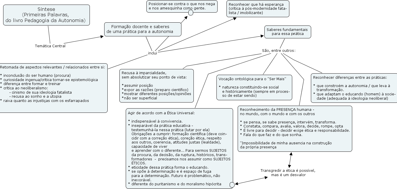 primeiras palavras, posicionar-se contra o que nos nega e nos amesquinha como gente., agir de acordo com a �tica universal indispens�vel � convivencia. insepar�vel da pr�tica educativa - testemunh�-la nessa pr�tica (lutar por ela) obriga��es a cumprir forma��o cient�fica (deve coin- cidir com a corre��o �tica), core��o �tica, respeito aos outros, coerencia, atitudes justas (lealdade), capacidade de viver e aprender com o diferente... para sermos sujeitos da procura, da decis�o, da ruptura, hist�ricos, trans- formadores - precisamos nos assumir como sujeitos �ticos. eticidade dessa pr�tica forma o educando. se op�e � determina��o e � espa�o de fuga para a determina��o. futuro � problem�tico, n�o inexor�vel. diferente do puritanismo e do moralismo hip�crita, recusa � imparcialidade, sem absolutizar seu ponto de vista assumir posi��o expor as raz�es (preparo cient�fico) mostrar diferentes posi��es opini�es n�o ser superficial, retomada de aspectos relevantes relacionados entre si inconclus�o do ser humano (procura) curiosidade ingenua cr�tica tornar-se epistemol�gica diferen�a entre formar e treinar cr�tica ao neoliberalismo - cinismo de sua ideologia fatalista - recusa ao sonho e a utopia raiva quanto as injusti�as com os esfarrapados , forma��o docente e saberes de uma pr�tica para a autonomia , reconhecer que h� esperan�a (cr�tica � p�s-modernidade fata- lista imobilizante), s�ntese (primeiras palavras, do livro pedagogia da autonomia) , reconhecer diferen�as entre as pr�ticas que constro�m a autonomia que leva � transforma��o. que adaptam o educando (homem) � socie- dade (adequada � ideologia neoliberal) , , reconhecimento da presen�a humana - no mundo, com o mundo e com os outros se pensa, se sabe presen�a, interv�m, transforma. constata, compara, avalia, valora, decide, rompe, opta � livre para decidir - decidir exige �tica e responsabilidade. fala do que faz e do que sonha. impossibilidade de minha ausencia na constru��o da pr�pria presen�a, voca��o ontol�gica para o ser mais natureza constituindo-se social e hist�ricamente (sempre em proces- so de estar sendo), saberes fundamentais para essa pr�tica,