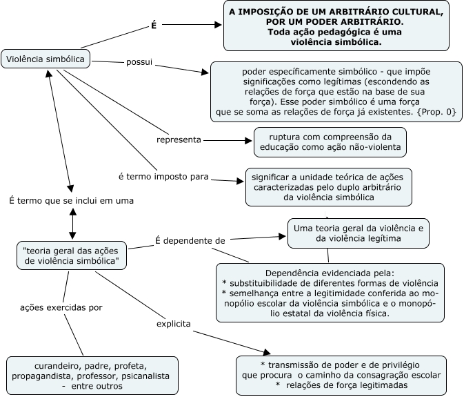 Esse mapa conceitual, produzido no IHMC CmapTools, tem a informação relacionada a: Violência Simbólica, Violência simbólica É termo que se inclui em uma "teoria geral das ações de violência simbólica", "teoria geral das ações de violência simbólica" É dependente de Dependência evidenciada pela: * substituibilidade de diferentes formas de violência * semelhança entre a legitimidade conferida ao mo- nopólio escolar da violência simbólica e o monopó- lio estatal da violência física., Violência simbólica É A IMPOSIÇÃO DE UM ARBITRÁRIO CULTURAL, POR UM PODER ARBITRÁRIO. Toda ação pedagógica é uma violência simbólica., "teoria geral das ações de violência simbólica" É dependente de Uma teoria geral da violência e da violência legítima, "teoria geral das ações de violência simbólica" explicita * transmissão de poder e de privilégio que procura o caminho da consagração escolar * relações de força legitimadas, Uma teoria geral da violência e da violência legítima Dependência evidenciada pela: * substituibilidade de diferentes formas de violência * semelhança entre a legitimidade conferida ao mo- nopólio escolar da violência simbólica e o monopó- lio estatal da violência física., "teoria geral das ações de violência simbólica" ações exercidas por curandeiro, padre, profeta, propagandista, professor, psicanalista - entre outros, Violência simbólica possui poder específicamente simbólico - que impõe significações como legítimas (escondendo as relações de força que estão na base de sua força). Esse poder simbólico é uma força que se soma as relações de força já existentes. {Prop. 0}, Violência simbólica é termo imposto para significar a unidade teórica de ações caracterizadas pelo duplo arbitrário da violência simbólica, Violência simbólica representa ruptura com compreensão da educação como ação não-violenta