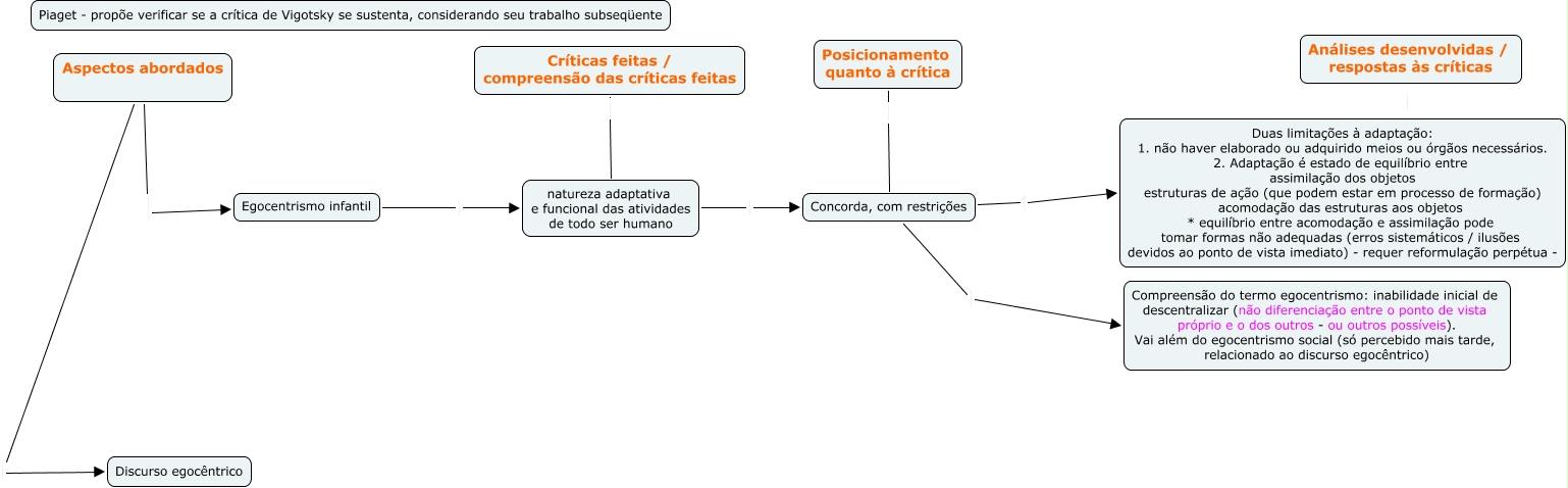 Esse mapa conceitual, produzido no IHMC CmapTools, tem a informação relacionada a: Piaget sobre Vygotsky, Concorda, com restrições Compreensão do termo egocentrismo: inabilidade inicial de descentralizar (não diferenciação entre o ponto de vista próprio e o dos outros - ou outros possíveis). Vai além do egocentrismo social (só percebido mais tarde, relacionado ao discurso egocêntrico), Concorda, com restrições Duas limitações à adaptação: 1. não haver elaborado ou adquirido meios ou órgãos necessários. 2. Adaptação é estado de equilíbrio entre assimilação dos objetos estruturas de ação (que podem estar em processo de formação) acomodação das estruturas aos objetos * equilíbrio entre acomodação e assimilação pode tomar formas não adequadas (erros sistemáticos / ilusões devidos ao ponto de vista imediato) - requer reformulação perpétua -, Posicionamento quanto à crítica Concorda, com restrições, Egocentrismo infantil natureza adaptativa e funcional das atividades de todo ser humano, Análises desenvolvidas / respostas às críticas Compreensão do termo egocentrismo: inabilidade inicial de descentralizar (não diferenciação entre o ponto de vista próprio e o dos outros - ou outros possíveis). Vai além do egocentrismo social (só percebido mais tarde, relacionado ao discurso egocêntrico), Críticas feitas / compreensão das críticas feitas natureza adaptativa e funcional das atividades de todo ser humano, Análises desenvolvidas / respostas às críticas Duas limitações à adaptação: 1. não haver elaborado ou adquirido meios ou órgãos necessários. 2. Adaptação é estado de equilíbrio entre assimilação dos objetos estruturas de ação (que podem estar em processo de formação) acomodação das estruturas aos objetos * equilíbrio entre acomodação e assimilação pode tomar formas não adequadas (erros sistemáticos / ilusões devidos ao ponto de vista imediato) - requer reformulação perpétua -, Aspectos abordados Egocentrismo infantil, Aspectos abordados Discurso egocêntrico, natureza adaptativa e funcional das atividades de todo ser humano Concorda, com restrições, Análises desenvolvidas / respostas às críticas Duas limitações à adaptação: 1. não haver elaborado ou adquirido meios ou órgãos necessários. 2. Adaptação é estado de equilíbrio entre assimilação dos objetos estruturas de ação (que podem estar em processo de formação) acomodação das estruturas aos objetos * equilíbrio entre acomodação e assimilação pode tomar formas não adequadas (erros sistemáticos / ilusões devidos ao ponto de vista imediato) - requer reformulação perpétua -, Aspectos abordados Egocentrismo infantil, Aspectos abordados Discurso egocêntrico