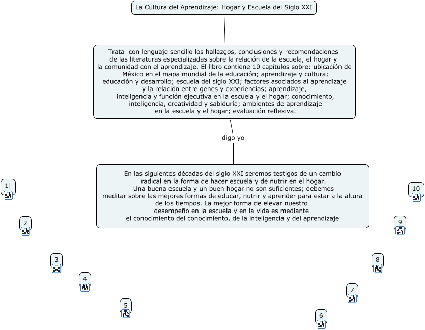 Este Cmap, tiene información relacionada con: La Cultura del Aprendizaje, Trata con lenguaje sencillo los hallazgos, conclusiones y recomendaciones de las literaturas especializadas sobre la relación de la escuela, el hogar y la comunidad con el aprendizaje. El libro contiene 10 capítulos sobre: ubicación de México en el mapa mundial de la educación; aprendizaje y cultura; educación y desarrollo; escuela del siglo XXI; factores asociados al aprendizaje y la relación entre genes y experiencias; aprendizaje, inteligencia y función ejecutiva en la escuela y el hogar; conocimiento, inteligencia, creatividad y sabiduría; ambientes de aprendizaje en la escuela y el hogar; evaluación reflexiva. digo yo En las siguientes décadas del siglo XXI seremos testigos de un cambio radical en la forma de hacer escuela y de nutrir en el hogar. Una buena escuela y un buen hogar no son suficientes; debemos meditar sobre las mejores formas de educar, nutrir y aprender para estar a la altura de los tiempos. La mejor forma de elevar nuestro desempeño en la escuela y en la vida es mediante el conocimiento del conocimiento, de la inteligencia y del aprendizaje, La Cultura del Aprendizaje: Hogar y Escuela del Siglo XXI ???? Trata con lenguaje sencillo los hallazgos, conclusiones y recomendaciones de las literaturas especializadas sobre la relación de la escuela, el hogar y la comunidad con el aprendizaje. El libro contiene 10 capítulos sobre: ubicación de México en el mapa mundial de la educación; aprendizaje y cultura; educación y desarrollo; escuela del siglo XXI; factores asociados al aprendizaje y la relación entre genes y experiencias; aprendizaje, inteligencia y función ejecutiva en la escuela y el hogar; conocimiento, inteligencia, creatividad y sabiduría; ambientes de aprendizaje en la escuela y el hogar; evaluación reflexiva.