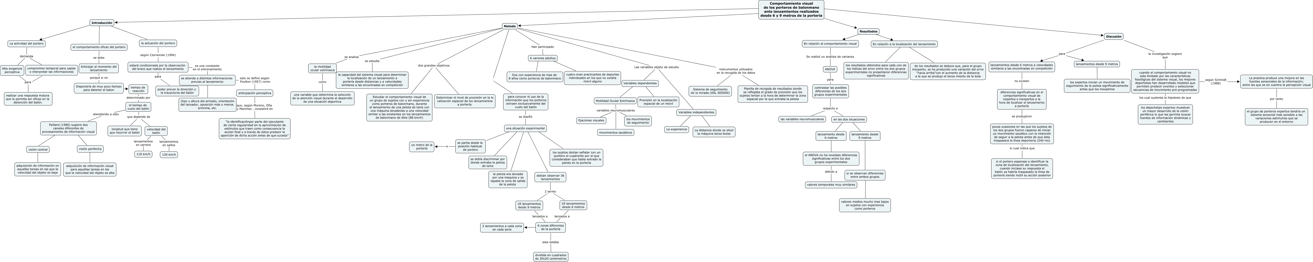 Este Cmap, tiene información relacionada con: Articulo 1, lanzamiento desde 9 metros ???? si se observan diferencias entre ambos grupos, La actividad del portero demanda Alta exigencia perceptiva, se atiende a distintas informaciones previas al lanzamiento esto se define según Poulton (1957) como anticipación perceptiva, Metodo se analiza la motilidad ocular extrínseca, si se observan diferencias entre ambos grupos ???? valores medios mucho mas bajos en sujetos con experiencia como porteros, Variables independientes ???? La distancia donde se situó la máquina lanza-bolas, Paillard (1980) sugiere dos canales diferentes de procesamiento de información visual ???? visión central, cuando el comportamiento visual no esta limitado por las características fisiológicas del sistema visual, los mejores deportistas han desarrollado modelos que permiten predecir eventos y seleccionar secuencias de movimiento pre-programadas los cual sustenta la hipotesis de que los deportistas expertos muestran un mayor desarrollo de la visión periférica lo que les permite buscar fuentes de información dinámicas y cambiantes, diferencias significativas en el comportamiento visual de expertos e inexpertos a la hora de localizar el lanzamiento a portería se produjeron pocas ocasiones en las que los sujetos de los dos grupos fueron capaces de iniciar un movimiento sacádico con la intención de seguir a la pelota antes de que ésta traspasara la línea deportería (240 ms), visión central ???? adquisición de información en aquellas tareas en las que la velocidad del objeto es baja, 6 zonas diferentes de la portería esta estaba dividida en cuadrados de 20x20 centimetros, 18 lanzamientos desde 9 metros lanzados a 6 zonas diferentes de la portería, 6 zonas diferentes de la portería ???? 3 lanzamientos a cada zona en cada serie, tiempo de reacción determinado por el tiempo de vuelo del balón, visión periferíca ???? adquisición de información visual para aquellas tareas en las que la velocidad del objeto es alta, Paillard (1980) sugiere dos canales diferentes de procesamiento de información visual ???? visión periferíca, Discusión la investigación sugiere que cuando el comportamiento visual no esta limitado por las características fisiológicas del sistema visual, los mejores deportistas han desarrollado modelos que permiten predecir eventos y seleccionar secuencias de movimiento pre-programadas, se atiende a distintas informaciones previas al lanzamiento ???? (tipo y altura del armado, orientación del lanzador, oposición más o menos próxima, etc., Variables independientes ???? La experiencia, anticipación perceptiva que, según Moreno, Oña y Martínez , consistirá en “la identificaciónpor parte del ejecutante de cierta regularidad en la aproximación de estímulos que traen como consecuencia la acción final y a través de éstos predecir la aparición de dicha acción antes de que suceda”