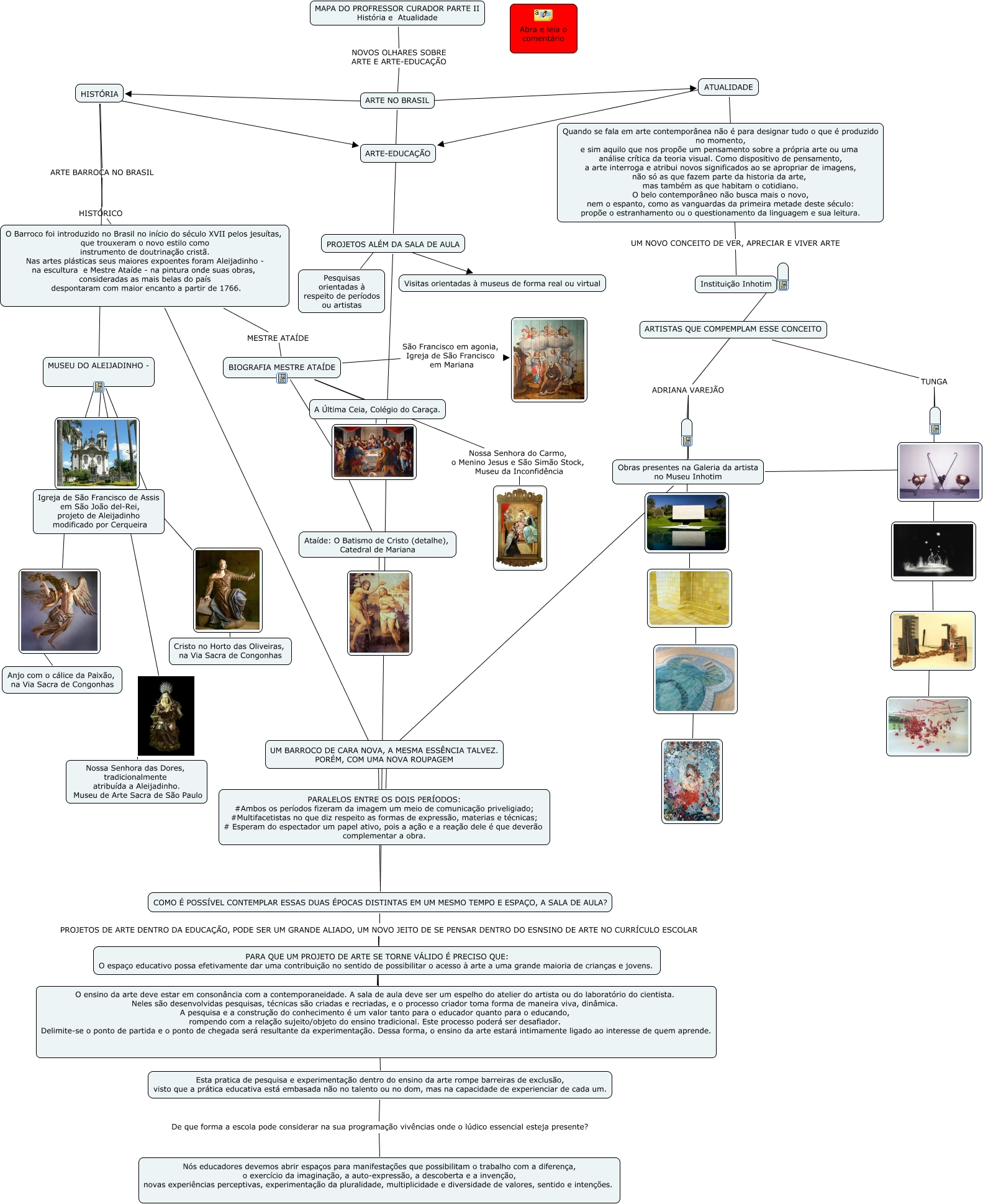 Esse mapa conceitual, produzido no IHMC CmapTools, tem a informação relacionada a: MAPA DO PROFESSOR CURADOR 3 - PARTE II, ARTISTAS QUE COMPEMPLAM ESSE CONCEITO TUNGA, ????, O Barroco foi introduzido no Brasil no início do século XVII pelos jesuítas, que trouxeram o novo estilo como instrumento de doutrinação cristã. Nas artes plásticas seus maiores expoentes foram Aleijadinho - na escultura e Mestre Ataíde - na pintura onde suas obras, consideradas as mais belas do país despontaram com maior encanto a partir de 1766. MESTRE ATAÍDE BIOGRAFIA MESTRE ATAÍDE, ARTE NO BRASIL ???? ATUALIDADE, ADRIANA VAREJÃO, Obras presentes na Galeria da artista no Museu Inhotim ????, O Barroco foi introduzido no Brasil no início do século XVII pelos jesuítas, que trouxeram o novo estilo como instrumento de doutrinação cristã. Nas artes plásticas seus maiores expoentes foram Aleijadinho - na escultura e Mestre Ataíde - na pintura onde suas obras, consideradas as mais belas do país despontaram com maior encanto a partir de 1766. ???? COMO É POSSÍVEL CONTEMPLAR ESSAS DUAS ÉPOCAS DISTINTAS EM UM MESMO TEMPO E ESPAÇO, A SALA DE AULA?, BIOGRAFIA MESTRE ATAÍDE São Francisco em agonia, Igreja de São Francisco em Mariana, ????, PROJETOS ALÉM DA SALA DE AULA ???? Pesquisas orientadas à respeito de períodos ou artistas, PROJETOS ALÉM DA SALA DE AULA ???? COMO É POSSÍVEL CONTEMPLAR ESSAS DUAS ÉPOCAS DISTINTAS EM UM MESMO TEMPO E ESPAÇO, A SALA DE AULA?, PROJETOS ALÉM DA SALA DE AULA ???? Visitas orientadas à museus de forma real ou virtual, Esta pratica de pesquisa e experimentação dentro do ensino da arte rompe barreiras de exclusão, visto que a prática educativa está embasada não no talento ou no dom, mas na capacidade de experienciar de cada um. De que forma a escola pode considerar na sua programação vivências onde o lúdico essencial esteja presente? Nós educadores devemos abrir espaços para manifestações que possibilitam o trabalho com a diferença, o exercício da imaginação, a auto-expressão, a descoberta e a invenção, novas experiências perceptivas, experimentação da pluralidade, multiplicidade e diversidade de valores, sentido e intenções., MUSEU DO ALEIJADINHO - ????, Ataíde: O Batismo de Cristo (detalhe), Catedral de Mariana ????, ???? Igreja de São Francisco de Assis em São João del-Rei, projeto de Aleijadinho modificado por Cerqueira, MUSEU DO ALEIJADINHO - ????, ADRIANA VAREJÃO, ARTISTAS QUE COMPEMPLAM ESSE CONCEITO TUNGA, ????