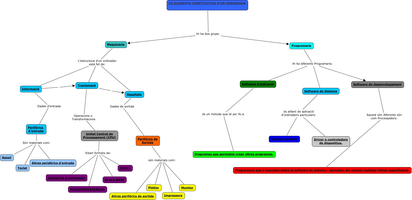 Este Cmap, tiene información relacionada con: mapaa de elements d'ordinador, Maquinaris L'estructura d'un ordinador está fet de: Resultats, Unitat Central de Processament (CPU) Estan formats de: PORTS, Perifèrics de Sortida són materials com: Plòtter, Perifèrics de Sortida són materials com: Altres perifèrics de sortida, Tractament Resultats, Unitat Central de Processament (CPU) Estan formats de: TARGETES D'EXPANSIÓ, Unitat Central de Processament (CPU) Estan formats de: MICROPROCESSADOR, Perifèrics d'entrada Són materials com: Teclat, III.ELEMENTS CONSTITUTIUS D'UN ORDINADOR Hi ha dos grups: Programaris, Maquinaris L'estructura d'un ordinador está fet de: Tractament, Resultats Dades de sortida Perifèrics de Sortida, Programaris Hi ha diferents Programaris: Software de desenvolupament, Perifèrics d'entrada Són materials com: Ratolí, Software de desenvolupament Aquest són diferents són com Processadors: Programaris que s'executen sobre el software de sistema i permeten als usuaris realitzar feines especifiques., Programaris Hi ha diferents Programaris: Software de Sistema, Informació Tractament, Tractament Operacions o Transformacions Unitat Central de Processament (CPU), Perifèrics d'entrada Són materials com: Altres peridèrics d'entrada, Informació Dades d'entrada Perifèrics d'entrada, Unitat Central de Processament (CPU) Estan formats de: PLACA BASE