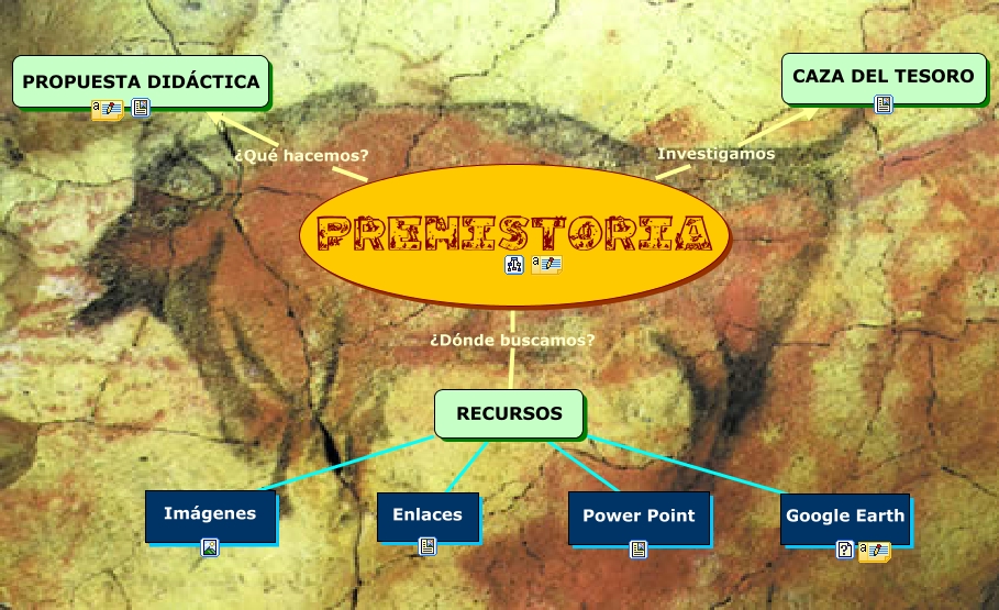 Este Cmap, tiene información relacionada con: Proyecto final_ la prehistoria, RECURSOS Imágenes, PREHISTORIA ¿Qué hacemos? PROPUESTA DIDÁCTICA, RECURSOS ???? Google Earth, RECURSOS ???? Power Point, PREHISTORIA ¿Dónde buscamos? RECURSOS, RECURSOS ???? Enlaces, PREHISTORIA Investigamos CAZA DEL TESORO