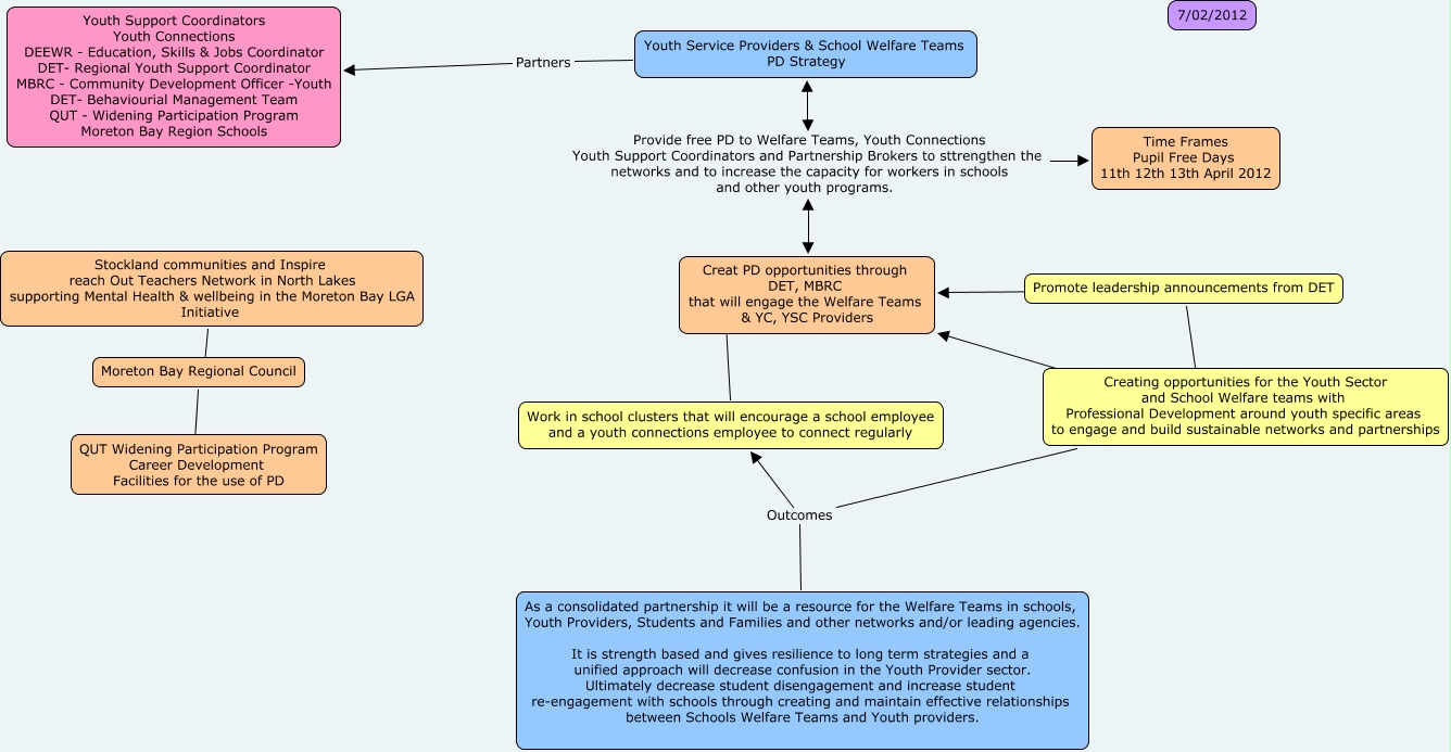 This Concept Map, created with IHMC CmapTools, has information related to: Nth Coast Region YC and DET PD Strategy, Youth Service Providers & School Welfare Teams PD Strategy Partners Youth Support Coordinators Youth Connections DEEWR - Education, Skills & Jobs Coordinator DET- Regional Youth Support Coordinator MBRC - Community Development Officer -Youth DET- Behaviourial Management Team QUT - Widening Participation Program Moreton Bay Region Schools, Creating opportunities for the Youth Sector and School Welfare teams with Professional Development around youth specific areas to engage and build sustainable networks and partnerships Outcomes Work in school clusters that will encourage a school employee and a youth connections employee to connect regularly, Moreton Bay Regional Council ???? QUT Widening Participation Program Career Development Facilities for the use of PD, Youth Service Providers & School Welfare Teams PD Strategy Provide free PD to Welfare Teams, Youth Connections Youth Support Coordinators and Partnership Brokers to sttrengthen the networks and to increase the capacity for workers in schools and other youth programs. Creat PD opportunities through DET, MBRC that will engage the Welfare Teams & YC, YSC Providers, Youth Service Providers & School Welfare Teams PD Strategy Provide free PD to Welfare Teams, Youth Connections Youth Support Coordinators and Partnership Brokers to sttrengthen the networks and to increase the capacity for workers in schools and other youth programs. Time Frames Pupil Free Days 11th 12th 13th April 2012, Creating opportunities for the Youth Sector and School Welfare teams with Professional Development around youth specific areas to engage and build sustainable networks and partnerships ???? Creat PD opportunities through DET, MBRC that will engage the Welfare Teams & YC, YSC Providers, Work in school clusters that will encourage a school employee and a youth connections employee to connect regularly ???? Creat PD opportunities through DET, MBRC that will engage the Welfare Teams & YC, YSC Providers, Stockland communities and Inspire reach Out Teachers Network in North Lakes supporting Mental Health & wellbeing in the Moreton Bay LGA Initiative ???? Moreton Bay Regional Council, Promote leadership announcements from DET ???? Creating opportunities for the Youth Sector and School Welfare teams with Professional Development around youth specific areas to engage and build sustainable networks and partnerships, Creating opportunities for the Youth Sector and School Welfare teams with Professional Development around youth specific areas to engage and build sustainable networks and partnerships Outcomes As a consolidated partnership it will be a resource for the Welfare Teams in schools, Youth Providers, Students and Families and other networks and/or leading agencies. It is strength based and gives resilience to long term strategies and a unified approach will decrease confusion in the Youth Provider sector. Ultimately decrease student disengagement and increase student re-engagement with schools through creating and maintain effective relationships between Schools Welfare Teams and Youth providers., Promote leadership announcements from DET ???? Creat PD opportunities through DET, MBRC that will engage the Welfare Teams & YC, YSC Providers