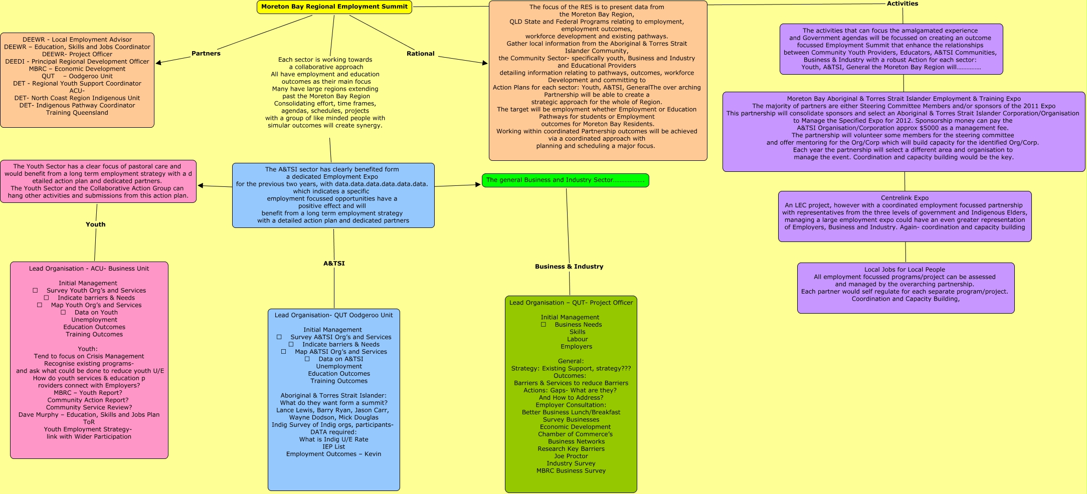 This Concept Map, created with IHMC CmapTools, has information related to: MB Regional Employment Summit, The general Business and Industry Sector………………. Business & Industry Lead Organisation – QUT- Project Officer Initial Management Business Needs Skills Labour Employers General: Strategy: Existing Support, strategy??? Outcomes: Barriers & Services to reduce Barriers Actions: Gaps- What are they? And How to Address? Employer Consultation: Better Business Lunch/Breakfast Survey Businesses Economic Development Chamber of Commerce’s Business Networks Research Key Barriers Joe Proctor Industry Survey MBRC Business Survey, Moreton Bay Regional Employment Summit Rational The focus of the RES is to present data from the Moreton Bay Region, QLD State and Federal Programs relating to employment, employment outcomes, workforce development and existing pathways. Gather local information from the Aboriginal & Torres Strait Islander Community, the Community Sector- specifically youth, Business and Industry and Educational Providers detailing information relating to pathways, outcomes, workforce Development and committing to Action Plans for each sector: Youth, A&TSI, GeneralThe over arching Partnership will be able to create a strategic approach for the whole of Region. The target will be employment whether Employment or Education Pathways for students or Employment outcomes for Moreton Bay Residents. Working within coordinated Partnership outcomes will be achieved via a coordinated approach with planning and scheduling a major focus., The A&TSI sector has clearly benefited form a dedicated Employment Expo for the previous two years, with data.data.data.data.data.data. which indicates a specific employment focussed opportunities have a positive effect and will benefit from a long term employment strategy with a detailed action plan and dedicated partners ???? The Youth Sector has a clear focus of pastoral care and would benefit from a long term employment strategy with a d etailed action plan and dedicated partners. The Youth Sector and the Collaborative Action Group can hang other activities and submissions from this action plan., Moreton Bay Regional Employment Summit Partners DEEWR - Local Employment Advisor DEEWR – Education, Skills and Jobs Coordinator DEEWR- Project Officer DEEDI - Principal Regional Development Officer MBRC – Economic Development QUT – Oodgeroo Unit DET - Regional Youth Support Coordinator ACU- DET- North Coast Region Indigenous Unit DET- Indigenous Pathway Coordinator Training Queensland, The A&TSI sector has clearly benefited form a dedicated Employment Expo for the previous two years, with data.data.data.data.data.data. which indicates a specific employment focussed opportunities have a positive effect and will benefit from a long term employment strategy with a detailed action plan and dedicated partners A&TSI Lead Organisation- QUT Oodgeroo Unit Initial Management Survey A&TSI Org’s and Services Indicate barriers & Needs Map A&TSI Org’s and Services Data on A&TSI Unemployment Education Outcomes Training Outcomes Aboriginal & Torres Strait Islander: What do they want form a summit? Lance Lewis, Barry Ryan, Jason Carr, Wayne Dodson, Mick Douglas Indig Survey of Indig orgs, participants- DATA required: What is Indig U/E Rate IEP List Employment Outcomes – Kevin, Moreton Bay Regional Employment Summit Activities Local Jobs for Local People All employment focussed programs/project can be assessed and managed by the overarching partnership. Each partner would self regulate for each separate program/project. Coordination and Capacity Building,, Moreton Bay Regional Employment Summit Each sector is working towards a collaborative approach All have employment and education outcomes as their main focus Many have large regions extending past the Moreton Bay Region Consolidating effort, time frames, agendas, schedules, projects with a group of like minded people with simular outcomes will create synergy. The A&TSI sector has clearly benefited form a dedicated Employment Expo for the previous two years, with data.data.data.data.data.data. which indicates a specific employment focussed opportunities have a positive effect and will benefit from a long term employment strategy with a detailed action plan and dedicated partners, The A&TSI sector has clearly benefited form a dedicated Employment Expo for the previous two years, with data.data.data.data.data.data. which indicates a specific employment focussed opportunities have a positive effect and will benefit from a long term employment strategy with a detailed action plan and dedicated partners ???? The general Business and Industry Sector………………., The Youth Sector has a clear focus of pastoral care and would benefit from a long term employment strategy with a d etailed action plan and dedicated partners. The Youth Sector and the Collaborative Action Group can hang other activities and submissions from this action plan. Youth Lead Organisation - ACU- Business Unit Initial Management Survey Youth Org’s and Services Indicate barriers & Needs Map Youth Org’s and Services Data on Youth Unemployment Education Outcomes Training Outcomes Youth: Tend to focus on Crisis Management Recognise existing programs- and ask what could be done to reduce youth U/E How do youth services & education p roviders connect with Employers? MBRC – Youth Report? Community Action Report? Community Service Review? Dave Murphy – Education, Skills and Jobs Plan ToR Youth Employment Strategy- link with Wider Participation