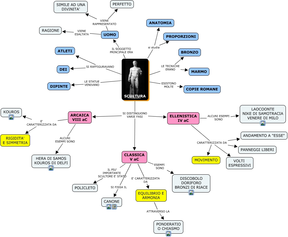 Questa Cmap, creata con IHMC CmapTools, contiene informazioni relative a: scultura, CLASSICA V aC IL PIU' IMPORTANTE SCULTORE E' STATO POLICLETO, SCULTURA si studia ANATOMIA, SCULTURA IL SOGGETTO PRINCIPALE ERA UOMO, EQUILIBRIO E ARMONIA ATTRAVERSO LA PONDERATIO O CHIASMO, UOMO VIENE RAPPRESENTATO PERFETTO, SCULTURA SI DISTINGUONO VARIE FASI CLASSICA V aC, SCULTURA si studia PROPORZIONI, SCULTURA SI RAFFIGURAVANO ATLETI, SCULTURA LE TECNICHE ERANO MARMO, SCULTURA ESISTONO MOLTE COPIE ROMANE, ELLENISTICA IV aC CARATTERIZZATA DA PANNEGGI LIBERI, SCULTURA SI RAFFIGURAVANO DEI, ELLENISTICA IV aC CARATTERIZZATA DA MOVIMENTO, CLASSICA V aC SI FISSA IL CANONE, ELLENISTICA IV aC CARATTERIZZATA DA VOLTI ESPRESSIVI, CLASSICA V aC E' CARATTERIZZATA DA EQUILIBRIO E ARMONIA, SCULTURA SI DISTINGUONO VARIE FASI ELLENISTICA IV aC, SCULTURA SI DISTINGUONO VARIE FASI ARCAICA VIII aC, ELLENISTICA IV aC CARATTERIZZATA DA ANDAMENTO A "ESSE", ELLENISTICA IV aC ALCUNI ESEMPI SONO LAOCOONTE NIKE DI SAMOTRACIA VENERE DI MILO