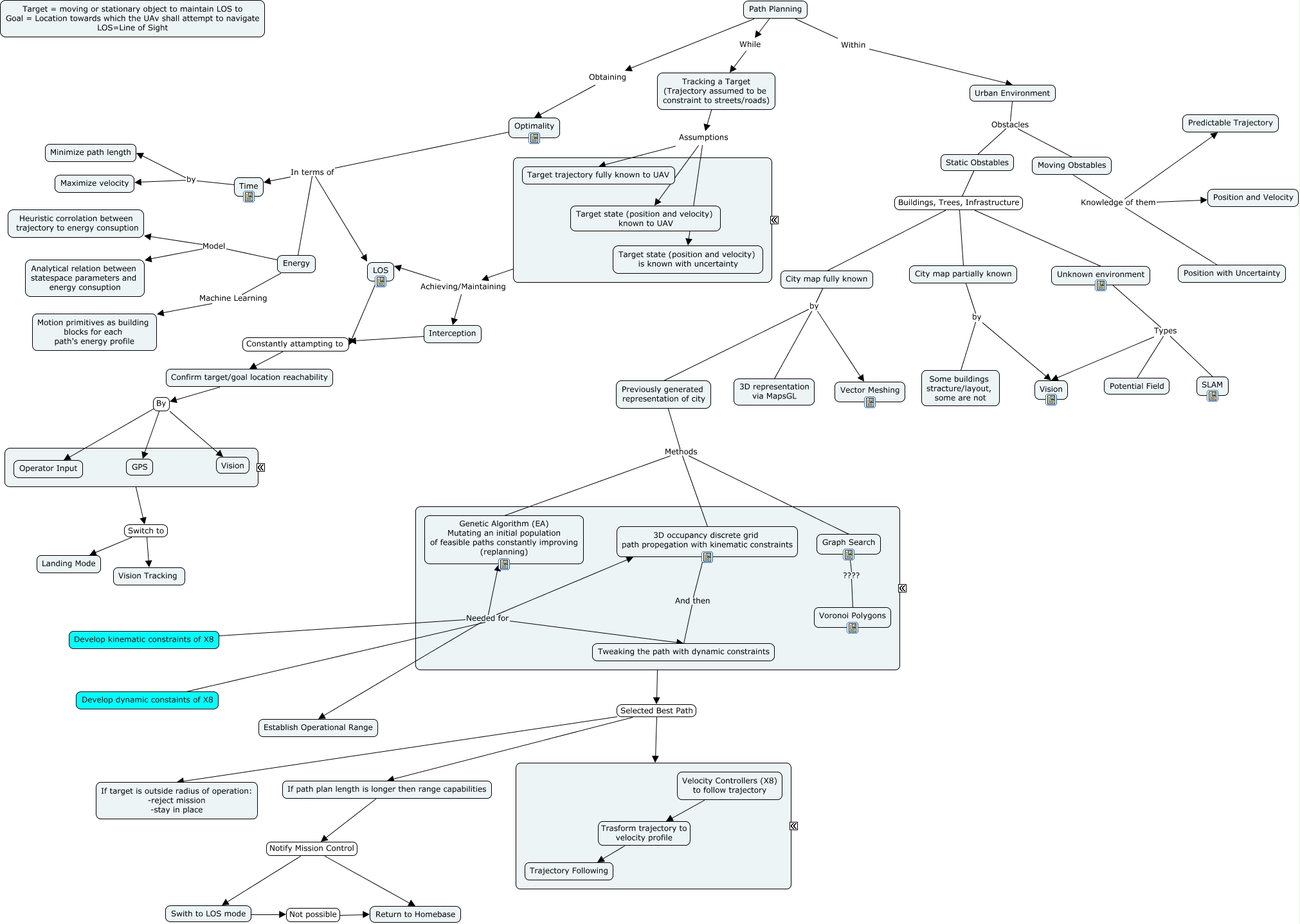 This Concept Map, created with IHMC CmapTools, has information related to: UAV motion planning, City map partially known by Some buildings stracture/layout, some are not, Ways to confirm Switch to Vision Tracking, Trajectory Generation Selected Best Path Trajectory Trackin, Trajectory Generation Selected Best Path If target is outside radius of operation: -reject mission -stay in place, Urban Environment Obstacles Moving Obstables, Energy Model Analytical relation between statespace parameters and energy consuption, Static Obstables Buildings, Trees, Infrastructure City map fully known, Interception Constantly attampting to Confirm target/goal location reachability, Confirm target/goal location reachability By Vision, Time by Minimize path length, Develop dynamic constaints of X8 Needed for Tweaking the path with dynamic constraints, Unknown environment Types Vision, Swith to LOS mode Not possible Return to Homebase, Previously generated representation of city Methods Graph Search, Energy Model Heuristic corrolation between trajectory to energy consuption, Develop dynamic constaints of X8 Needed for 3D occupancy discrete grid path propegation with kinematic constraints, Tracking a Target (Trajectory assumed to be constraint to streets/roads) Assumptions Target state (position and velocity) known to UAV, Optimality In terms of Time, Static Obstables Buildings, Trees, Infrastructure Unknown environment, Develop dynamic constaints of X8 Needed for Establish Operational Range