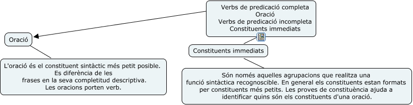 This Concept Map, created with IHMC CmapTools, has information related to: sintaxi, Oració ???? L'oració és el constituent sintàctic més petit posible. Es diferència de les frases en la seva completitud descriptiva. Les oracions porten verb., Constituents immediats ???? Són només aquelles agrupacions que realitza una funció sintàctica recognoscible. En general els constituents estan formats per constituents més petits. Les proves de constituència ajuda a identificar quins són els constituents d'una oració., Verbs de predicació completa Oració Verbs de predicació incompleta Constituents immediats ???? Constituents immediats, Verbs de predicació completa Oració Verbs de predicació incompleta Constituents immediats ???? Oració